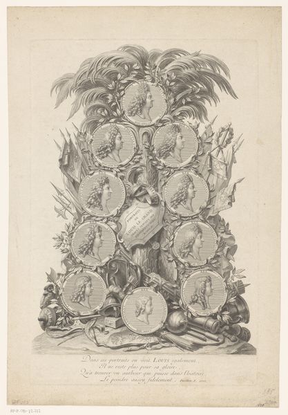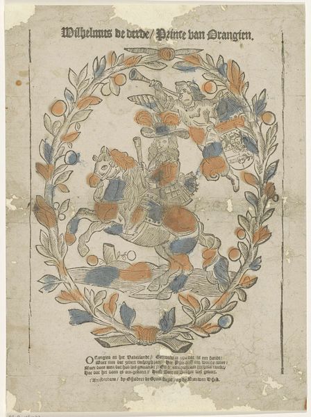 Curator: Here we have “Hier hebt gij fraaije bloemen; / Wie zou natuur niet roemen?” a print dating from around 1832-1850 by W. & J. Hissink. It's an etching with ink, portraying a stylized bouquet in a vase, flanked by two birds. Editor: It's...charming. But almost hauntingly so. The colors are so muted, a kind of blue and faded orange. And those birds – one pecking at something on the ground, the other looking forlornly upwards. What’s the overall effect meant to be? Curator: That's interesting, I think you are responding to what are rather standardized conventions of popular imagery. These kinds of prints were produced in quantity for the kind of petit-bourgeois market interested in domestic ornament, visual tropes on nature, and simple affirmations of piety and gratitude. That is made evident in the inscribed title below the vase which states “Here are fine flowers, who would not praise nature?” Editor: Gratitude. Yes, I suppose I was missing the point! But even in its piety, there's still that melancholy lurking. Maybe it’s just me, but those almost sickly colors suggest something faded, or past. Even nature itself feels somehow artificial, tamed within that ornate vase. Curator: These decorative prints would likely have had a different effect at their time. As a reminder of nature’s abundance for a population experiencing the environmental consequences of urbanization and industrial growth. And also remember the role of color in such prints, likely applied by workshop assistants as one part of the reproduction process. But indeed, the overall formality, with these neatly arranged blooms, contrasts starkly with the wildness they aim to capture. The placement of the two little birds introduces something of a genre painting. Editor: That helps me to place it in time, socially. Now I can almost imagine this print adorning the parlor of a modest home, offering a carefully curated vision of beauty and plenty. So I guess that hint of melancholy wasn't quite what the creators intended. Curator: Precisely. But your feelings toward the art are not necessarily 'wrong'! After all, as it circulates in culture across decades and centuries, we receive different messages from it based on where we find it, where it's kept, what we're seeing in the world at the moment of witnessing. I think it all counts. Editor: Right. I mean, who’s to say a touch of melancholy wasn't present even then, humming beneath the surface of the gratitude? Either way, the combination certainly makes for an intriguing image. Curator: Indeed! Thanks for your take on this little print, I found it quite illuminating.
