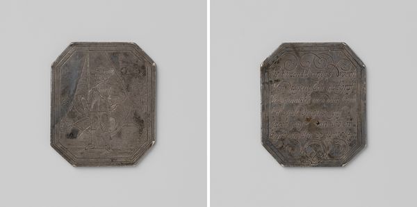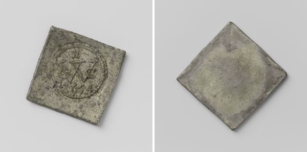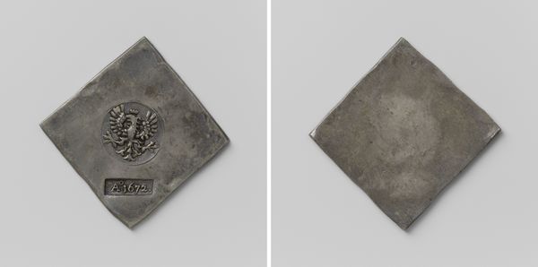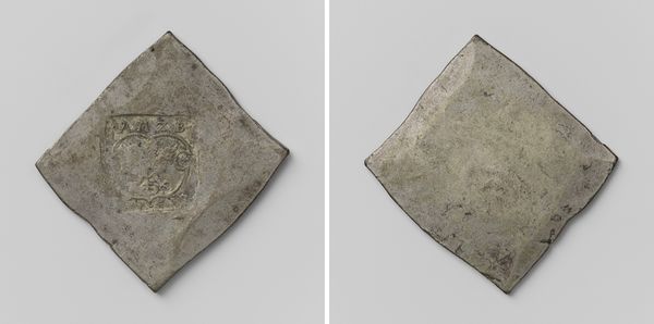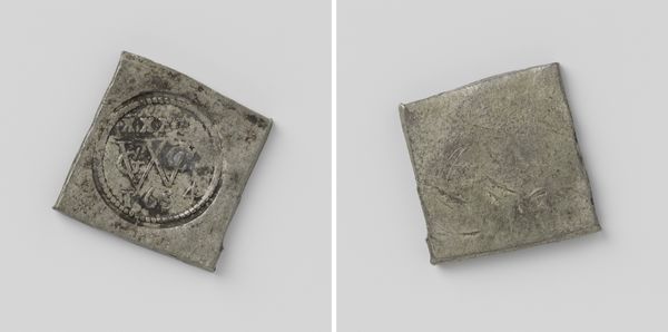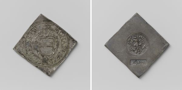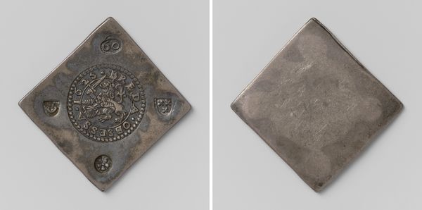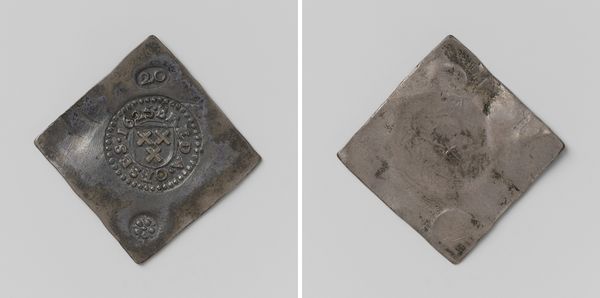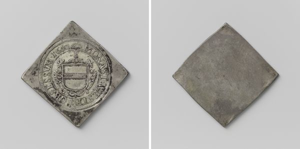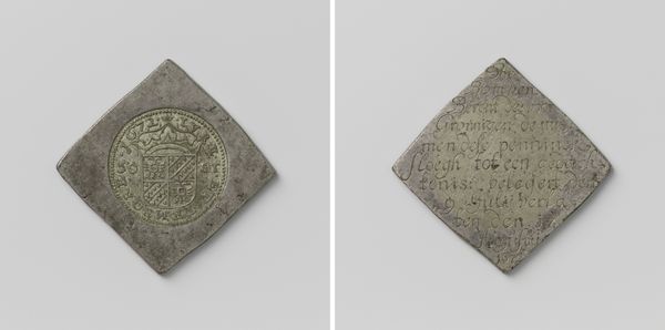 Editor: This is a "Daalder," an emergency coin, made in Groningen during the siege of 1672. It commemorates the capture of Coevorden. Created anonymously from metal, it almost looks like a little treasure, but there’s something sad about it too…it's heavy, a weighty relic of a difficult moment. What strikes you about it? Curator: The very shape grabs me—a deliberate square trying to be a circle on one side, a written decree on the other! It shouts resourcefulness, doesn’t it? During sieges, conventional money disappears, so civic leaders melted down anything available—pots, pans, church bells—into these emergency coins. Each one is a tiny monument to resilience. I can almost hear the hammering and feel the tension of the moment… what do you think of when looking at its relief and inscription? Editor: It definitely speaks to ingenuity. The inscription looks elaborate, almost decorative. The shield on the other side feels quite grand considering the circumstances. Is this a common artifact? Curator: Common, in a historical sense. Many cities under siege produced such coins. But each coin is unique in its specifics – the weight of silver available, the urgency of the situation. These aren’t just bits of metal; they’re little capsules of civic desperation and pride all mixed together! And the inscriptions... do you read them as boasts, prayers, or maybe just news reports? Editor: Perhaps all three! A fascinating piece of history rendered into something almost… pocket-sized. Thank you! Curator: My pleasure! It always delights me how everyday objects can whisper such incredible stories. There’s so much to unpack from just a single, misshapen coin.