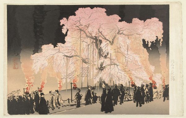 Kobayashi Kiyochika created this woodblock print, ‘Fireworks At Ikenohata’, in the late nineteenth century. The print captures a night scene filled with a sense of awe and fleeting beauty. Kiyochika masterfully uses dark blues and blacks to depict the night sky, against which the vibrant fireworks and lanterns create a striking contrast. The composition is structured around the interplay of light and shadow. The silhouettes of the crowd and a makeshift viewing platform anchor the foreground, while the bursts of fireworks and the reflections on the water draw the eye upwards and into the distance. The lanterns, strung across the scene, punctuate the darkness with warm, glowing orbs, adding a sense of depth and perspective. Kiyochika’s approach to form here is fascinating; he uses traditional techniques to capture a modern spectacle, reflecting broader cultural shifts in Japan as it navigated tradition and modernity. The ephemeral nature of fireworks, juxtaposed with the enduring medium of woodblock printing, highlights a tension between the transient and the permanent, questioning our perception of time and space.