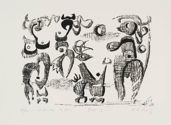Curator: This untitled print by Professor Karl-Otto Götz, created in 1983, immediately strikes me with its bold, almost primal energy. Editor: Indeed. The stark black and white, the roughly hewn shapes, evoke a sense of raw, unfiltered expression. Is there a connection to the Gutai movement here? Curator: Götz was a key figure in German Informel, and influenced the Gutai group's exploration of action painting. This work demonstrates his interest in spontaneous gesture, reflecting the postwar desire for artistic freedom. Editor: The composition, seemingly chaotic at first glance, reveals a careful arrangement of forms. The interplay of positive and negative space creates a visual rhythm. Curator: Absolutely. And understanding its context is essential—post-war Germany, a nation rebuilding, artists seeking new forms of expression to grapple with trauma and uncertainty. Editor: The rawness and lack of overt control point toward a broader societal rejection of established norms. It's fascinating how one sees the artist's own psychological processing externalized through the work. Curator: Precisely. The lack of figuration allows for a direct engagement with the materials and the artist's process. It's a deeply felt statement, even decades later. Editor: I am reminded of Dadaist aesthetics and the importance of pure emotion as a reaction to the social context that birthed it.