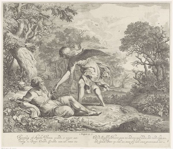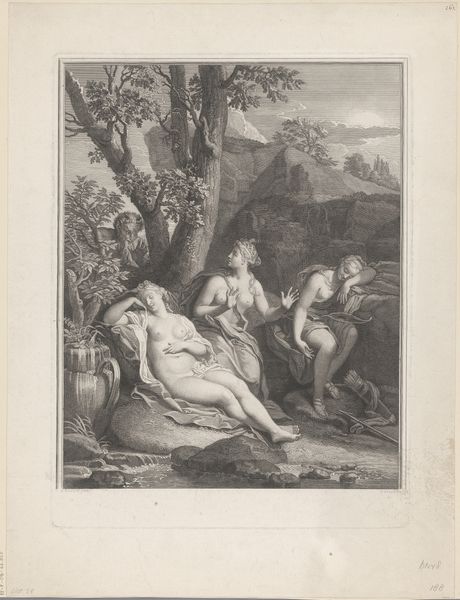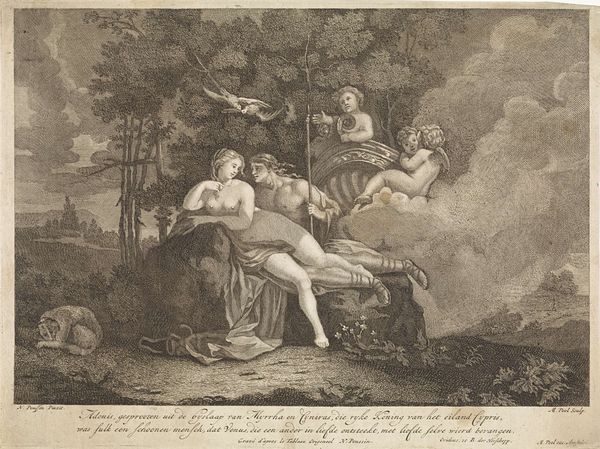 Editor: This is "The Death of Abel," a 1766 etching by Richard Earlom, based on a painting by Andrea Sacchi. It's quite stark, and the way Abel is laid out seems so… deliberate. What do you make of this print? Curator: It’s fascinating to consider this print through a materialist lens. Consider the economic realities embedded in its creation. Etching allowed for wider distribution than a unique painting, democratizing access to imagery. The lines etched into the metal plate – those very marks – speak to a laborious process. Think of the artisan, Earlom, translating Sacchi’s original. Editor: So, the labor involved changes how we see the image itself? Curator: Precisely. How does the mechanical reproduction, the print medium itself, alter the message compared to Sacchi's original painting? It removes the hand of the 'master' painter. We see here the beginnings of mass production influencing art’s consumption. The lines, created through acid and metal, allowed the story to be spread beyond a wealthy patron's walls. Consider also how the material used -- the ink, paper, and metal -- would have been sourced and traded, connecting the art to broader economic networks. Does seeing the labor that went into creating it, compared to just looking at the finished product, alter your understanding of the image’s value? Editor: Definitely! I hadn't thought about it that way. The print isn't just about the biblical story, it is a record of early mass media and manufacturing processes. Curator: It's a commodity, embedded within a system of production, exchange, and consumption. So how does thinking about that change how you experience "The Death of Abel"? Editor: I see that the story is embedded in labor, production and social layers that were not initially apparent, as well as distribution of this idea. Curator: Exactly! Art is inseparable from the conditions of its making and dissemination.
