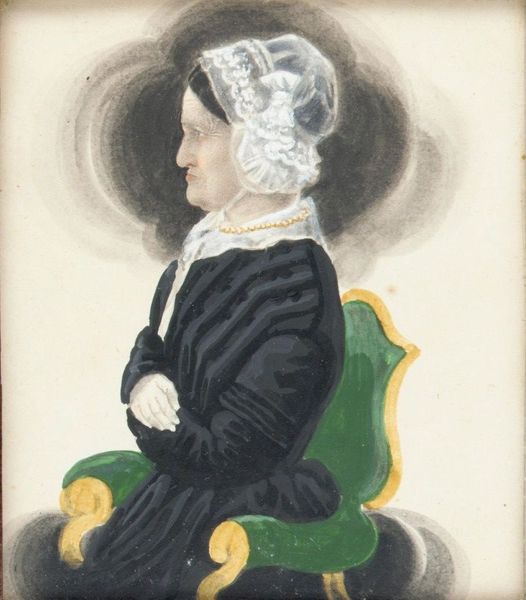 Editor: This is Micah Williams's "Portrait of a Woman with a Lace Cap," from around 1823, made with pastel. It's so interesting how the artist used a limited color palette. What jumps out at you when you look at this portrait? Curator: The most striking aspect is the contrast. We observe the juxtaposition between the flatness of the background and the textured treatment of the lace. Semiotically, the lace cap itself functions as a signifier of status, carefully rendered to denote the sitter’s place in society. Editor: So, the artist is using form to convey information about the subject? Curator: Precisely. Notice also the precise lines defining the face, sharply contrasting with the softer rendering of her dress. The color values serve to isolate the head within the composition. Editor: That’s a great point; it really does make the face the focal point. How would you consider the relationship between the book she is holding, and her expression? Curator: The book introduces another element to decode. One could view the portrait as constructed from binary oppositions, from the textural variances to the interplay between activity –reading– and a rather impassive countenance. It compels one to interpret the relation between the intellectual life and the domestic sphere in the early 19th century. Editor: It sounds like analyzing the form and composition gives us a lot to think about regarding the context too. I'll definitely look at portraits with a new eye now! Curator: Indeed. Paying attention to form enhances our understanding of a portrait's meaning.