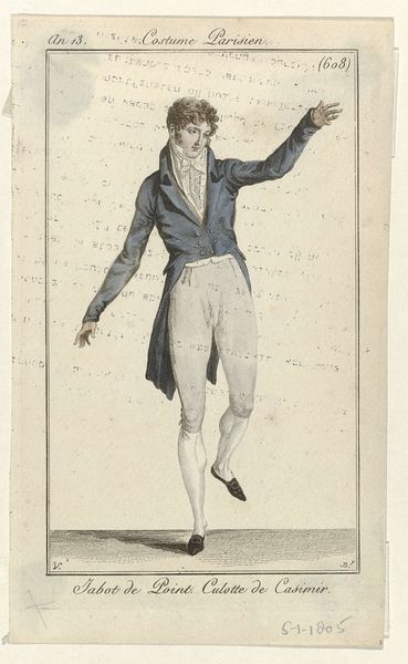 Curator: This is a print titled "Journal des Dames et des Modes: Men’s Fashion," dating from 1803. The artist credited is Pierre Charles Baquoy, and you can find it here at the Rijksmuseum. Editor: My initial impression? Slightly satirical. The exaggerated proportions and the somewhat stiff pose of the figure hint at a commentary on the fashions of the time. Curator: It's fascinating how print media, like this very example, shaped and disseminated fashion trends in the early 19th century. "Journal des Dames et des Modes" wasn't just showing clothing; it was creating a dialogue around status and aspiration. The labour behind each individual print and it's role of democratization of visual culture cannot be ignored. Editor: Absolutely, the costume itself tells a story. The high collar, the cut of the coat, the tied breeches, everything works together to create a specific visual language. Notice how the light catches the folds of the cravat, drawing the eye. It is a game of lines, forms and shadows. Curator: I'm more interested in the societal impact and reach that Baquoy and the "Journal" had. The etching was relatively easy to reproduce compared to painting. The intended audience played a large part in defining tastes and even contributing to Paris becoming an important city in global production chains and consumer behaviours. Editor: Fair point, though I'm drawn to the visual tension. There's something inherently contradictory about rendering something as fleeting as fashion in a static, durable medium like a print. The way the artist manipulates line and form allows us to have visual communication and discourse about status in 19th-century French society. Curator: In essence, this work encapsulates how visual culture was commodified, distributed, and consumed during the rise of industrial capitalism. Even his pose is communicating to those seeing it for a possible market for the costume. Editor: Indeed, this print cleverly freezes a specific moment in time, prompting us to examine the codes of elegance and satire through a purely visual frame. Curator: So much can be unearthed by digging deep into the labour practices surrounding "Costume Parisien" – it definitely makes this etching one worth our attention. Editor: Precisely. It's the intersection of meticulous detail and visual rhetoric that makes this work so compelling.