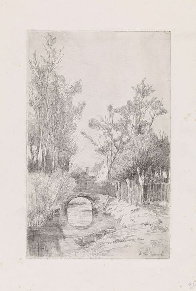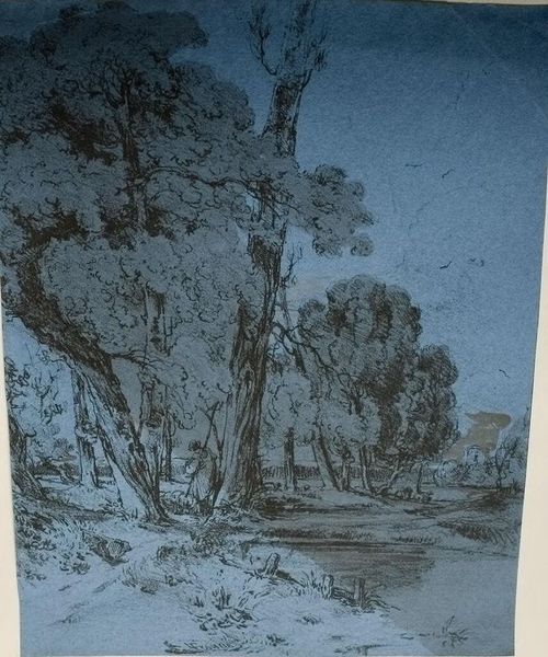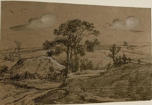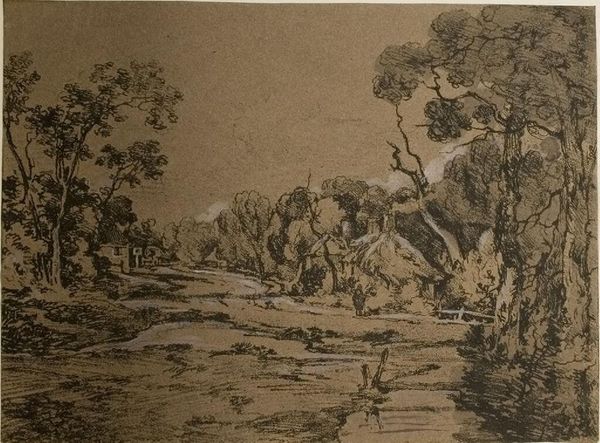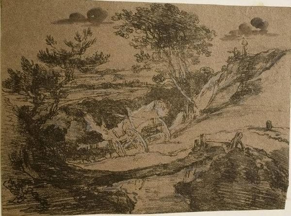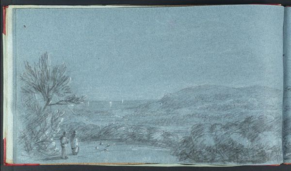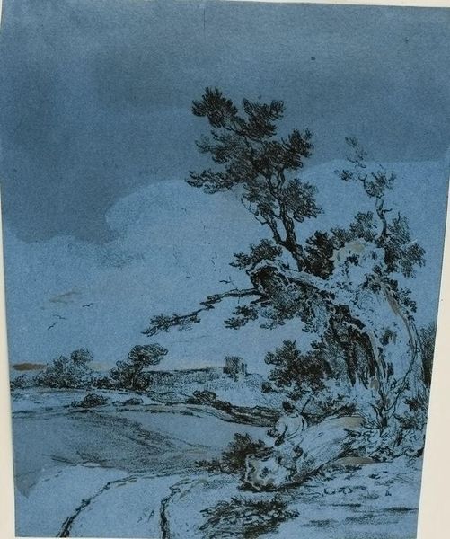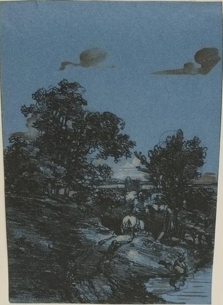 Curator: This is "Plate Twenty-five" by François Louis Thomas Francia, currently residing at the Harvard Art Museums. It presents an interesting commentary on the picturesque tradition. Editor: My first impression is quiet melancholy. The blue monochrome and the lone figure give it this contemplative air, like a faded dream. Curator: It's fascinating how Francia uses this limited palette to evoke a sense of distance. This print underscores the romantic idealization of rural life prevalent in early 19th-century art. Editor: Absolutely. It feels both intimate and vast, capturing a moment of solitary existence within a larger, somewhat indifferent world. The way the light barely kisses the trees is almost haunting. Curator: Indeed, and that tension—the individual versus the landscape—was a key theme of the era. Francia's strategic composition emphasizes humanity's place within the natural order. Editor: Looking closer, I notice the texture and the artist's hand. Despite the somber mood, there's still a warmth, a certain embrace of the imperfect, that feels very human, wouldn't you say? Curator: I agree. Francia's plate offers a lens into a bygone era, reminding us of the enduring power of the landscape to shape our perceptions and identities. Editor: It also subtly hints at the quiet dignity of ordinary lives, often overshadowed in grand narratives, I think. A lovely echo of what it means to be human, right here, right now.