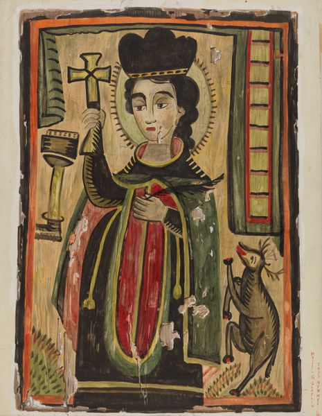 Editor: This watercolor, "Santo," created in 1936, depicts what looks like a small religious icon. It has a primitive quality that makes it feel almost like folk art. What catches your eye when you look at this piece? Curator: Immediately, I'm drawn to the support itself – the simulation of aged or even decaying wood. The artist calls attention to the materials, the literal base upon which this representation is built. The very "thingness" of the santo. How does this material presentation affect the icon's perceived sacredness for you? Editor: It's almost contradictory. The image implies reverence, but the degraded material clashes with that, it takes on a different meaning when presented this way.. Curator: Precisely. Notice, too, the evident brushstrokes of the watercolour paint. They are less concerned with illusionism and more about revealing the artist's hand. Does this emphasis on the production process democratize the image in some way, bringing it closer to everyday labor rather than divine intervention? Consider the difference in perception had this been oil on canvas... Editor: I think so, It makes me think less about an ethereal image and more about the process involved, even making me wonder if this painting mimics some other art making material. Curator: And how that "mimicry" interacts with ideas about "authenticity." What materials does it bring to your mind? The labor involved in craft versus "fine art"? Perhaps think about this object as part of a cycle of production, consumption and possible re-use of its material parts? Editor: I hadn't considered that angle, but it reframes the whole piece. Instead of just seeing a religious image, I'm now thinking about the artistic process, the materials themselves, and how they shape our understanding. It seems so connected to labor! Thank you! Curator: My pleasure. Reflecting on material production definitely opens up different ways of experiencing this miniature piece.