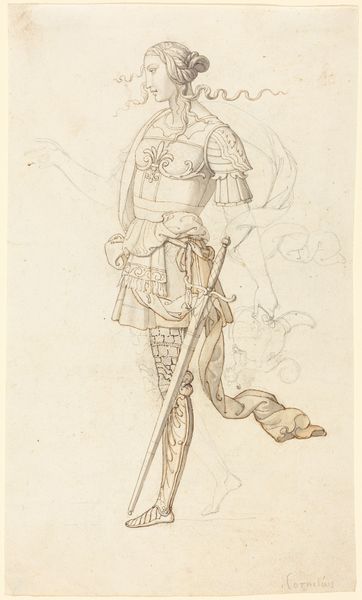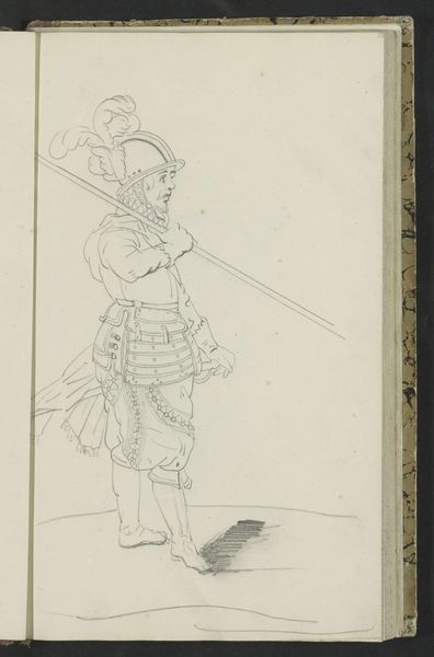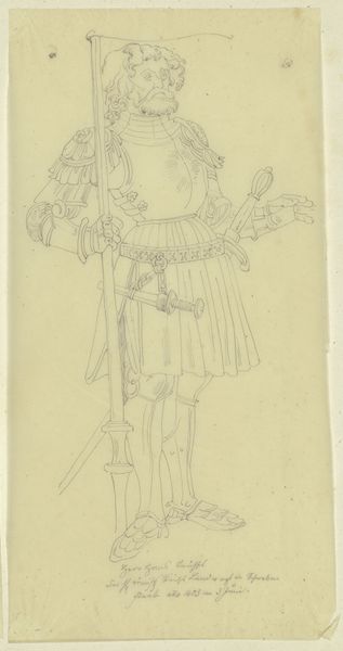 Curator: We're looking at "Georg von Waldburg," a pencil drawing housed here at the Städel Museum. Editor: My first thought is, it looks remarkably gentle, considering the subject is clad in full armor. Curator: The artist's handling of line certainly contributes to that impression. Notice the delicate, almost hesitant quality of the strokes defining the figure's contours. There's a transparency, a sense of incompleteness, that softens what could be a more rigid, martial representation. Editor: Right, and consider the symbolism. We have Georg depicted with the flag and sword of a military leader, a symbol of power, contrasted with his calm almost docile, face. It doesn’t scream strength and victory. This dichotomy makes it more than just a historical documentation of armor and status. What do you read in his gaze? Curator: The linear simplicity is really doing the most important thing, isn't it? To create this striking figure that balances all the aspects of the knight and the historical context we should read into that choice as the artist’s technique, their method. I'm less inclined to speculate on intent here and more curious about execution. Editor: Ah, but isn't intent subtly woven into the execution itself? Think of armor throughout history. Each minute part carries layers of protection but the emblems, crests and decorations signify everything beyond basic physical use, family or power, success or standing... I’m reminded how this medieval world always speaks symbolically. Curator: Precisely! Editor: Seeing him like this offers an intimacy that other, more finished works lack. Curator: I think what ultimately intrigues me here is how this particular combination of meticulous rendering of details. There is a real tenderness in the portrayal—completely defies what we might anticipate from a depiction of medieval armament. Editor: Agreed. It's a great piece of material culture, and it invites us to read into all the rich meanings woven through medieval history.