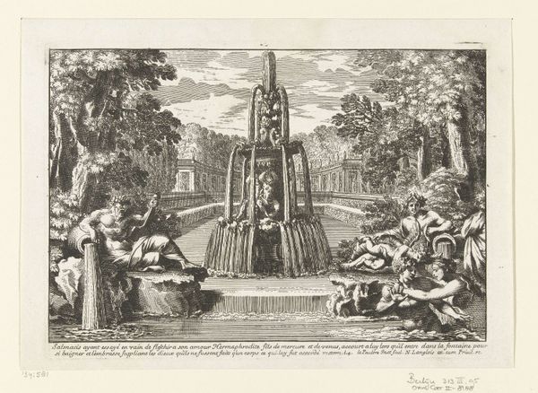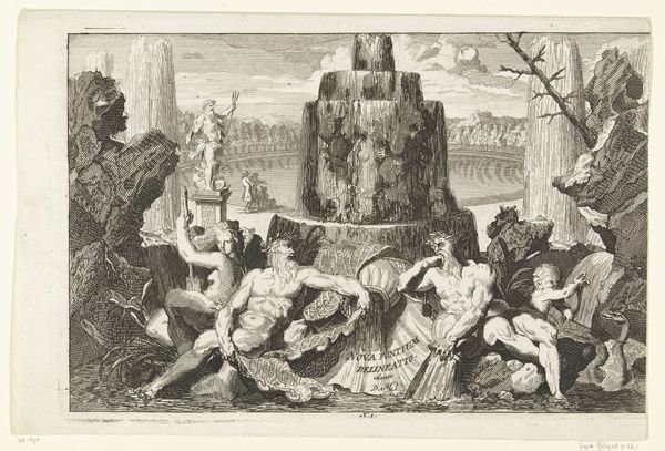 Laurens Scherm created this print, "Narcissus cascade in de tuin van Paleis Het Loo", capturing the cascade as a performance of power and mythological narrative. Scherm, working in the late 17th century, was deeply embedded in a society where royal image and classical allegories intertwined. Here, we see the story of Narcissus, a figure of classical myth, rendered in the formal gardens of a royal palace. Narcissus, known for his beauty, was cursed to fall in love with his own reflection. The original tale is one of tragic self-obsession, but within the context of royal gardens, how might this narrative shift? The palace gardens were carefully designed spaces, meant to display control over nature and, by extension, dominion over society. The inclusion of onlookers, dressed in the fashion of the time, adds another layer. Are they merely witnessing a scene, or are they implicated in the performance of power and beauty? The cascade becomes a stage, where identity, myth, and social hierarchy converge. This print invites us to consider how spaces and stories can be manipulated to reflect and reinforce societal structures.