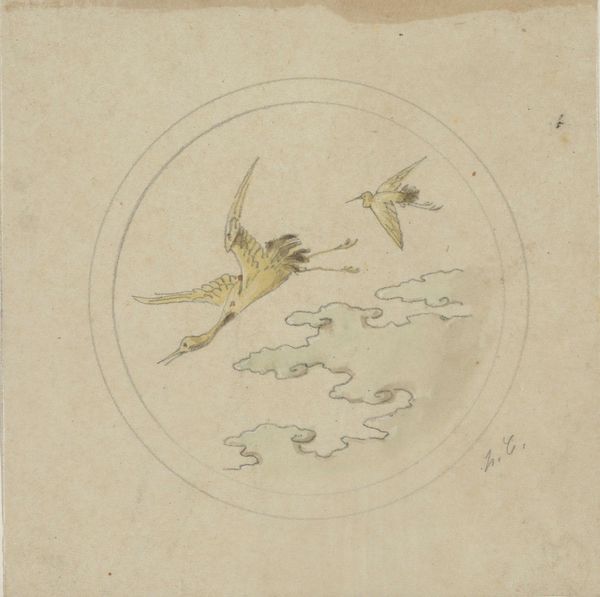 Gustave Fraipont made this design for a plate with watercolor and graphite. He was a French artist who lived from 1849 to 1923. This work provides a glimpse into the applied arts and design culture of the late 19th and early 20th centuries, reflecting the era's fascination with naturalistic imagery and its integration into everyday objects. The design features two fish, one yellow and one blue, swimming downwards amongst some foliage. The circular format suggests its intended use for a decorative plate. Made in France, the design reflects the aesthetic values of the time, when the decorative arts were undergoing significant changes, influenced by movements such as Art Nouveau, with its emphasis on organic forms. This particular piece is relatively subdued, it does not reach the heights of elaborate ornamentation typical of that style. To fully understand Fraipont's design, it is essential to consider not just the visual elements, but the broader cultural context. Through careful historical research, including examining design catalogs and period publications, we can gain insight into the artist's work. The meaning of art is contingent on its social and institutional context.