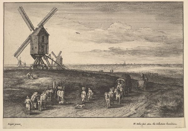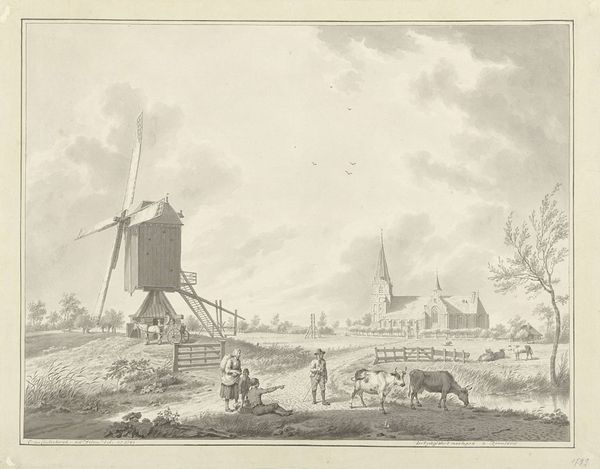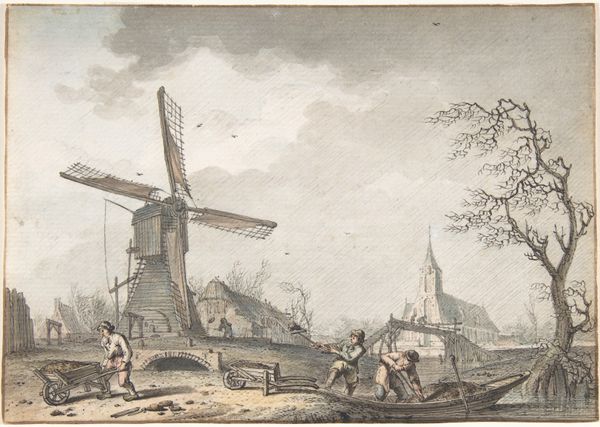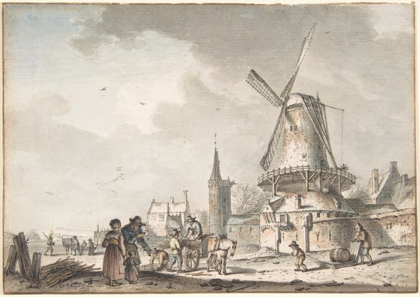 Curator: We are looking at "Winter Landscape with a Ship Lift and Windmill", a watercolor and ink drawing attributed to Jan Hulswit. Editor: It’s quite beautiful, this snowy vista. There's a melancholy about the frozen landscape that’s rather captivating. All of this human labor caught in the still cold. Curator: Precisely! The sheer variety of activity, all centered around this ingenious machinery: a ship lift powered presumably by that very prominent windmill, demonstrates human engagement with their environment. Editor: The windmill is striking—a real visual anchor. And I notice a second, more distant one in the background. What's the symbolic importance here? Are they standing in for more than simple wheat grinding? Is it the constant presence of human industrialism? Curator: Absolutely. These windmills become representative of Dutch innovation and adaptation; remember that land reclamation through drainage was fundamental to Dutch prosperity at that period. Hulswit places these mechanical structures to emphasize our constant reshaping of the landscape. Editor: I see so many layered symbols now; you pointed this out so helpfully. It goes beyond pure topography. Note the clothing of the figures and even the positioning of the boats to the left – there’s more there than one first notices! They almost form little emblems. Curator: Indeed. He portrays not only the visual landscape but the social dynamics, hinting at class and gender roles inherent to a thriving river society. Editor: So the materials and craft also subtly communicate that which a purely art-historical or historical explanation fails to grasp. Very intriguing! I find it difficult not to reflect on it, imagining what kind of conditions such construction might be involved with! Curator: Well put. By examining these kinds of details we enrich our appreciation and insight into the lived world within the art. Editor: I leave appreciating all the new visual layers now present, a rich social and emotional panorama behind the pastoral scenes.