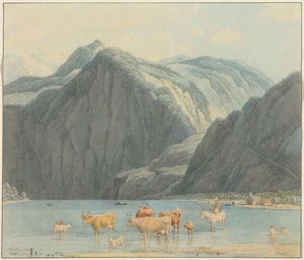 Curator: Thomas Sully gives us "Mountain Scene with Stream, Cows and Figures" using watercolour, capturing a pastoral vision. Editor: Whoa, there’s an ethereal vibe here. I feel like I’ve stumbled into a fairy tale, all gentle peaks and bovine serenity. Curator: Watercolour lends itself well to creating an idealized representation, don't you think? Sully uses layering, creating a sense of depth and airiness that romanticizes the landscape. The cows almost seem part of some Arcadian ideal, harking back to classical notions of the rural idyll. Editor: Right, that idyllic sense is overwhelming here. Look how the humans are just tiny bystanders within the scene! What gets me is the sense of time. Like this scene exists outside of human anxieties, in its own bubble of tranquility. There's even an anthropomorphic thing going on... giving these towering mountains character, making them stoic figures of stability and endurance. Curator: Landscapes often carry symbolic weight relating to human spirituality, particularly concerning notions of divine nature, or a lost paradise. Think of the stream; it serves as a symbol of renewal, the unwavering current echoing nature's relentless rhythms. The cows, as a symbol, are all about bounty and peace, linking back to prehistoric associations of domestic animals giving plenty. Editor: Yes! That river reflecting and refreshing and quietly hinting at some hidden potential, you know? All very suggestive of something we may have lost touch with. The colour palette amplifies it: mostly muted but tinged with light. Gives me a feeling of wistful hopefulness. It has a therapeutic feel; if it was bigger, I'd meditate in front of it. Curator: Sully is really channeling his own experience and presenting it to the audience in a comforting manner; this piece really connects on an elemental level, a dream of returning to nature. Editor: It does create an ideal and the invitation into its fold seems heartfelt. Curator: A landscape rich in layered symbolisms, each whispering its contribution. Editor: For sure. Something grounding about encountering that sense of timeless serenity in watercolour.