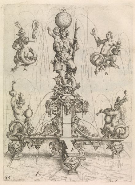 Curator: I am absolutely fascinated by "Design for a Fountain, Plate 119 from Dietterlin's Architectura," an engraving crafted by Wendel Dietterlin the Elder around 1598. Its intricate detailing just draws you in. Editor: My first thought? It's delightfully bonkers! A baroque acid trip waiting to happen! It feels… well, architecturally theatrical. Almost aggressively ornamental. Curator: Precisely! The piece sits firmly within both Mannerist and Baroque sensibilities. This was a time when art sought to overwhelm, to create these intense, emotionally charged experiences, which ties into socio-political upheaval from the period. Look at how classical figuration blends seamlessly with monstrous, almost grotesque, creatures. What does that say about the era? Editor: Grotesque is right! Those strange mermaid-dragon things at the bottom look like they crawled straight out of a nightmare… or maybe a really adventurous kid’s imagination. It is an intriguing synthesis, a way, perhaps, of marrying order with chaos, and civilization with its primordial fears. Water is life but can destroy it. And look closely… there are no two faces alike. Curator: Good eye! This deliberate choice directs us toward deeper consideration. Architectural pattern books, such as Dietterlin’s Architectura, were integral in shaping the visual language of their time, promoting particular ideologies through architectural forms and allegorical decorations. Considering the placement of female figures, often conjoined with these hybrid beasts, prompts us to examine prevailing views around gender and the monstrous feminine in late 16th-century society. Editor: Absolutely! Makes me wonder about the function of art then – to both reflect and dictate social norms. Makes you realize that design isn't just about pretty pictures. Everything carries a weight, intentional or otherwise. Looking at this drawing makes me wonder if Dietterlin himself realized how provocative his fountain design was. Curator: Well, provocative or not, Dietterlin’s fusion of mythology, symbolism, and architectural fantasy offers us today a complex dialogue with a distant, yet remarkably present, past. Editor: Yeah, and reminds us to question whose narratives are amplified in art and design and who is often left at the bottom with the mermen.