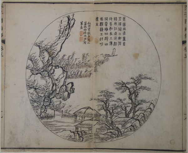 Editor: This is “Old Trees by Li Cheng, as interpreted by Kuncan, from the Mustard Seed Garden Manual of Painting," created around 1679. It's an ink drawing and woodblock print. It seems quite desolate, almost brittle, but in a strangely beautiful way. What draws your eye to this piece? Curator: The most striking feature is undoubtedly the composition. Observe how Kuncan, following Li Cheng, arranges the elements within the fan shape. The stark, angular branches of the old trees create a dynamic interplay with the softer, rounded forms of the rocks. Note the negative space; how does that influence the visual weight of the depicted objects? Editor: It makes the trees feel even more isolated, I think. Like they're clinging to the landscape. And what about the figure, almost swallowed up by the scene? Curator: Precisely. The figure, rendered with minimal detail, serves to emphasize the immensity and indifference of nature. This contributes to a sense of loneliness, perhaps even insignificance. Consider the use of line here as well. The calligraphic quality is interesting. What thoughts arise when examining it closely? Editor: It feels intentional, precise even. But how does the 'manual of painting' aspect influence our understanding of the image? Is it meant as an instruction? Curator: Yes, the "Mustard Seed Garden Manual" was intended as a teaching aid. Thus, each element serves as an exemplar of a particular technique or style. Focus on how the artist uses brushstrokes to differentiate the textures of the trees versus the rocks. Note the differing pressure and speed of the marks, almost a lesson. Editor: I see! So, we’re looking at both an artistic expression and a guide to artistic technique. The formal elements work together to convey both emotion and instruction. Curator: Indeed. And through this visual economy, Kuncan not only interprets Li Cheng's vision but also communicates essential principles of Chinese landscape painting, encapsulating history, technique and expression in a single work. Editor: This has certainly broadened my understanding, providing context beyond the immediate visual impact.