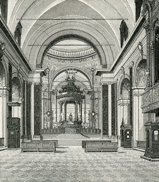 Curator: This is Luigi Rossini's print, "S. Maria in Trastevere." Editor: The architecture is grand, but there’s a somber, almost austere feel to the image. The geometry seems to underscore a rigid social order. Curator: Rossini was quite invested in depicting Roman monuments to reveal the city's socio-cultural dynamics. Note how the basilica overwhelms the people. Editor: The endless colonnades certainly create that sense of awe. I’m drawn to the coffered ceiling; those geometric patterns resonate with divine order and power. Curator: Precisely, the basilica was a central node of both spiritual and secular power. The imagery underscores the Church's influence on Roman society and culture. Editor: And those figures, scattered in prayer, seem almost dwarfed by the sheer scale, emphasizing their dependence on that power. Fascinating. Curator: Indeed. Rossini's print captures not just a building, but the very essence of Rome's power dynamics. Editor: It offers a powerful glimpse into how spatial representation shapes our understanding of cultural authority.