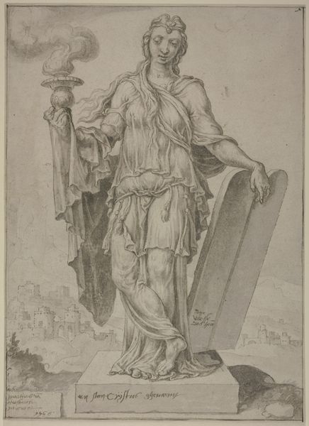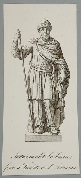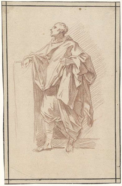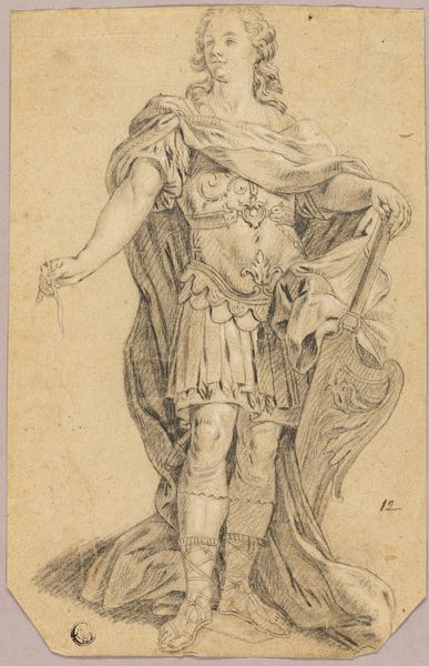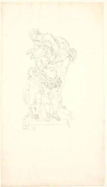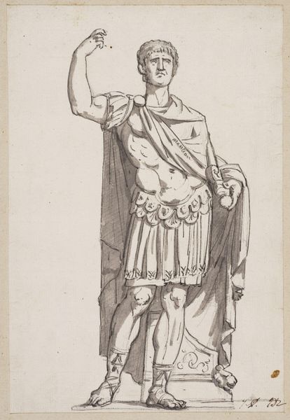 Louis Royer sketched this design for a statue of a military commander in pen and brown ink. Born in the Netherlands during a period of French rule, Royer was a leading sculptor whose work reflects the social and political values of the Dutch monarchy. This drawing captures the traditional heroic ideal. Note the laurel wreath, armor, and commanding pose, all classic symbols of military power. The commander’s identity is not known, but the design embodies an idealized vision of leadership. Consider the emotional impact of such monuments: they were designed to inspire patriotism, respect for authority, and perhaps, to suppress dissent. Royer's sketch invites us to reflect on how public art shapes collective memory and reinforces particular narratives about power and national identity. The very act of immortalizing a figure in stone raises questions about who gets remembered and why.
