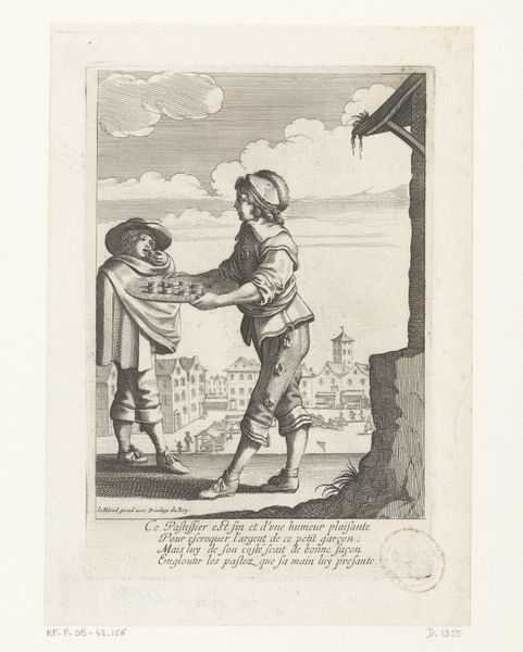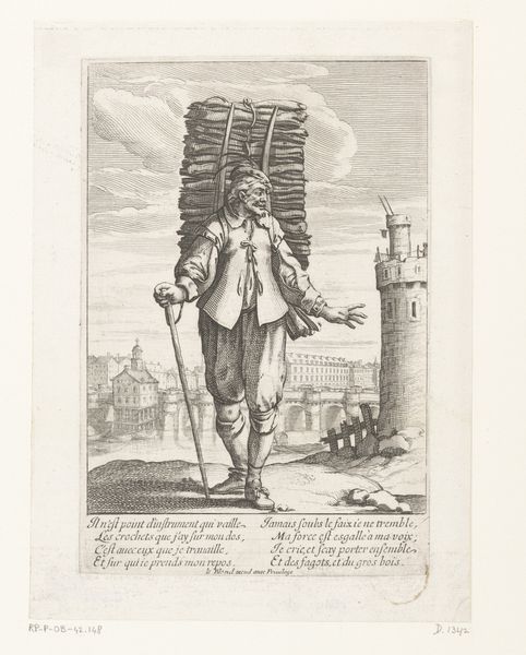 Abraham Bosse created this print, titled "Waterdrager," capturing a water carrier in a cityscape. Notice the water carrier himself, burdened yet resilient, as he transports his heavy load. Water, often a symbol of purity and life, takes on a more complex meaning here, set against the backdrop of 17th-century urban life. Consider the broader history of water-bearing figures in art, from ancient Egyptian depictions of bearers of life-giving waters to classical nymphs associated with springs and rivers. Here, the water carrier has lost its divine quality, instead bearing the weight of daily life. Think of the Greek myth of Aquarius, the water pourer. Is it possible to imagine the echo of his generous offering in this modest figure? The simple act of carrying water becomes laden with historical and psychological weight. Water is essential, but it can also be destructive. We see how cultural memory and subconscious processes may have affected the production and interpretation of a water carrier, a humble and universal figure. In the history of images, the human relationship with water is a recurring theme, an archetypal narrative. This reflects the enduring power of visual symbols across time and space.