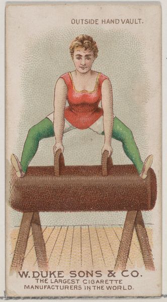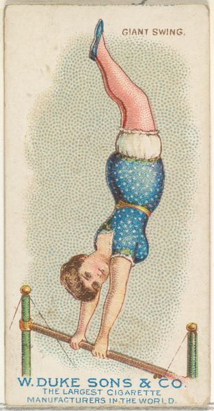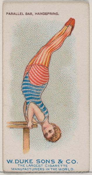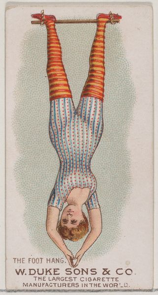 This small chromolithograph, "Slow Pull Up," was produced around 1890 by W. Duke, Sons & Co. as part of a series of collectible cards included in cigarette packs. These cards, popular at the time, offer a glimpse into the era's cultural values and gender ideals. The image depicts a woman in a striped garment, possibly swimwear, engaging in a gymnastic exercise. However, her pose and attire subtly blend athleticism with an appeal to the male gaze. The card suggests a tension between the emerging physical independence of women and their continued representation as objects of desire. It invites us to reflect on the complex ways in which women were portrayed in popular culture. This tension highlights the ongoing negotiation of female identity in a rapidly changing society. How does this image reflect or challenge the traditional roles assigned to women at the time?