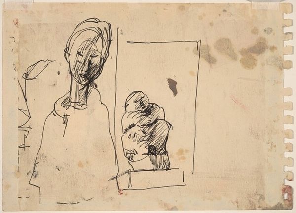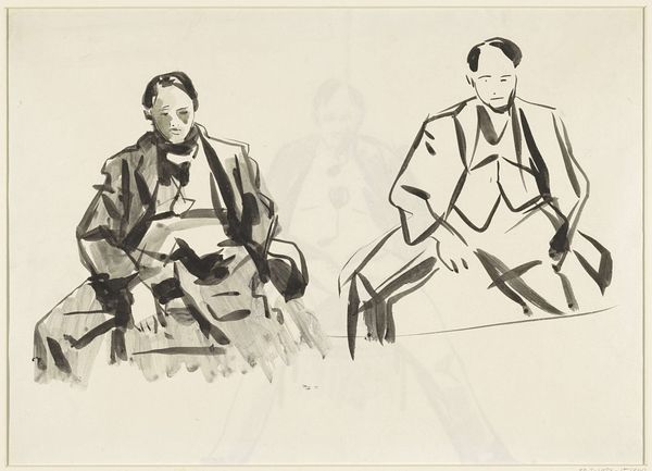 Editor: Here we have Aat Verhoog’s "Naar oude groepsfoto", or "After an old group photo," made before 1958. It's an ink drawing depicting three figures, and there's something haunting about its simplicity. What do you see in it? Curator: I’m immediately drawn to the materiality here – the ink bleeding into the paper, the artist’s hand so evident in the varying line weights. It emphasizes the labor and process inherent in its creation. But it also provokes an inquiry to its place of production in the cultural context. Look at the stark contrast, particularly the dark washes; what do those suggest to you about the availability or quality of materials? Or, more broadly, the historical constraints within the art world? Editor: I hadn’t thought about it that way, more that the strong contrast gives the drawing a lot of its drama, I see a story here about rural life… the materials adding to the emotion. I was focusing more on its symbolic power. Curator: But that’s exactly where the material informs the symbolic! Consider the time. Before 1958. Post-war Netherlands. Resources might have been limited, demanding a resourcefulness that dictated artistic choices. The apparent austerity could then be read not just as aesthetic choice but as a reflection of a wider societal constraint of resources during the time, thereby inflecting Verhoog's artistry. How does that reading reshape the emotional impact for you? Editor: That adds a whole other layer – this feeling isn’t just the emotion in the image, but an emotionality shaped by material reality. It makes the family portrayed seem resilient, not just stoic. Curator: Exactly! By engaging with the materials and the means of production, we’re actually unpacking layers of historical and social context, making the drawing speak beyond its immediate figuration. It highlights the connections between art, labor, and consumption. Editor: This has definitely given me a new way to look at the artist’s choices. I will be focusing on process for my next assignment. Curator: Remember, by closely investigating materiality, we uncover the unseen narratives embedded within the work of art.
