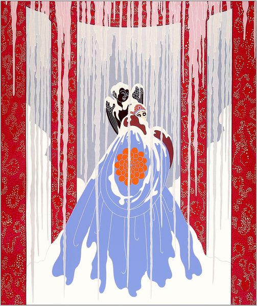 Erté made "Helen of Troy" using gouache and ink, media closely associated with commercial design in the early 20th century. The flat planes of color and crisp, graphic lines are characteristic of Erté's work, and were well-suited to reproduction in magazines and prints. It's fascinating to consider how these artistic and commercial practices are intertwined. Erté applied paint with precision. The ink outlines emphasize the forms and add to the overall sense of stylization. The deep black background amplifies the figures, drawing the eye to the stylized drapery and decorative elements. The shields on either side depict battling figures, while the geometric shapes and patterns in the design reflect the influence of Art Deco. The title of this artwork implies a narrative and recalls both classical and modern sensibilities. Erté blurred the boundaries between art, fashion, and commercial design, and offers a window into the cultural and aesthetic values of the early 20th century.