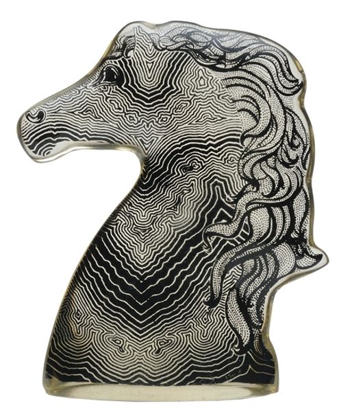 This enigmatic horse head by Abraham Palatnik presents us with a striking image, its sleek lines belying a deeper resonance. Consider the horse itself, an ancient symbol of power, freedom, and virility, revered across cultures from the steeds of Greek gods to the warhorses of medieval knights. Yet, here, the horse is rendered with a modern twist, its form stylized and almost abstracted, with its stark black and white stripes evoking a zebra, disrupting our expectations. This interplay of tradition and innovation reflects how symbols evolve, accumulating new layers of meaning as they journey through time. One could compare it with the horses of the Apocalypse, which once represented death and destruction, but now, in certain contexts, might represent powerful change. We see how collective memory reshapes and reinterprets age-old archetypes, engaging our subconscious on a profound level. The enduring allure of the horse persists, a testament to its primal power and cultural significance.