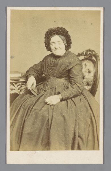This is "Portrait of an Unknown Old Woman," a photograph of 106 by 61mm by V. Vagneur. The sepia tone lends the photograph an air of nostalgia. The composition is dominated by the seated figure of the old woman, arranged diagonally from the lower left to the upper right, creating a sense of dynamic asymmetry within the frame. Her dark clothing contrasts subtly with the lighter background. The sharp lines of the books and table setting create depth and texture in the composition. Photographs like this disrupt conventional portraiture through their realism and documentation. Here, the emphasis on the materiality and texture, from the rough fabric to the detail of the woman's face, challenges traditional notions of beauty and representation. The photograph's function as a cultural signifier invites reflection on aging, representation, and the semiotics of visual encoding. Note the use of light and shadow, creating texture and depth that engage with broader artistic and philosophical concerns about the human condition.