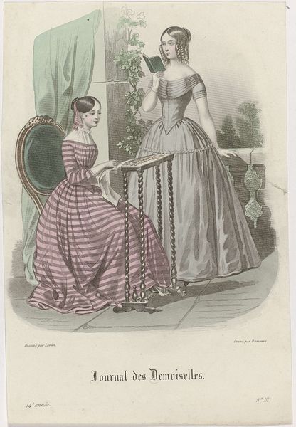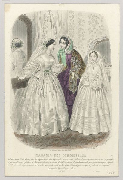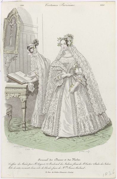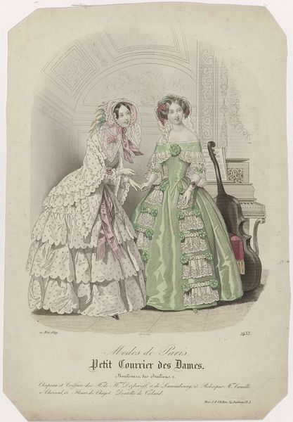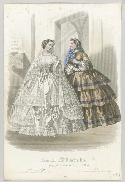 Editor: Here we have "Les Modes Parisiennes, 1856, No. 677," an engraving by Montaut d'Oleron. Gabriel Xavier, depicting two women in fashionable dresses. The sheer amount of lace seems quite decadent to me, very luxurious. What strikes you when you look at it? Curator: The first thing I see is the labor involved in producing these garments. The delicate lace, the detailed cashmere – these materials represent significant human effort. Who was producing these textiles, and under what conditions? Were they creating them by choice or economic necessity? Editor: That’s interesting. I hadn’t considered the people behind the textiles themselves. Do you think that affects how the image was received by viewers in 1856? Curator: Absolutely. These "Modes Parisiennes" represent a culture of consumption, where the value lies in the finished product, often obscuring the material conditions and labor practices that underpin it. We should consider what's celebrated versus what's concealed here. Editor: So you’re saying the print is not just about beauty, but about the relationship between artistry, materials, and class? Curator: Precisely. Think about the engraving itself: the printmaking process allowed for mass distribution, democratizing fashion trends for those who could afford them. The print functions as both documentation and advertisement of these coveted items. Who had access to these images, and what messages were being sent about wealth, taste, and the status of women? Editor: That makes me rethink my initial impression completely. I was just focusing on the aesthetic of the dresses. Curator: It's easy to get lost in the finery. However, engaging with the object’s materiality and production processes offers a crucial layer of understanding, don't you think? Editor: Definitely. Looking at it from a materialist perspective adds a whole new level of complexity, highlighting the socioeconomic dimensions embedded within the artwork. Thanks!