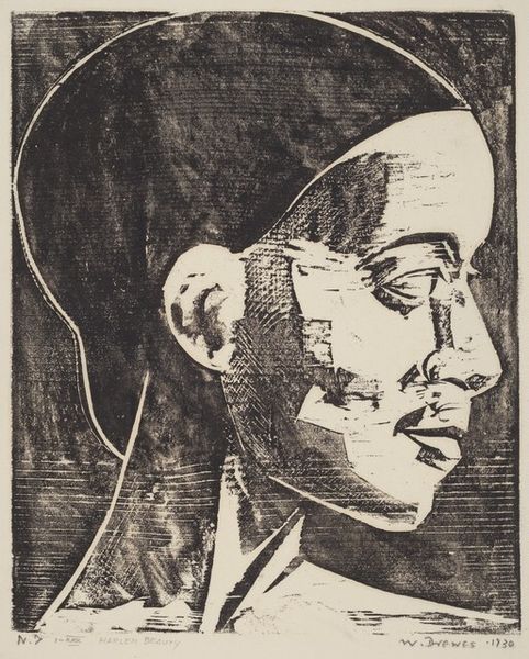 Editor: We're looking at Erich Heckel’s 1920 ink print, "Portrait of E.G." It's a striking image. I'm really drawn to the angularity of the lines and the stark contrast. It’s incredibly direct, almost unsettling. What do you see in this piece? Curator: Formally, I’m intrigued by the dynamic interplay of line and negative space. Note how the sharply defined contour of the subject’s face is juxtaposed with the more gestural, almost frenetic marks defining the surrounding space. The artist employs a strategic disjunction, fracturing the pictorial plane and unsettling any singular reading. What do you make of the relationship between the figure and ground? Editor: That makes me think about how the background isn't just 'background'. The strokes feel really deliberate and they give the portrait such an anxious energy. Do you think the dark and light contrast is important for setting a mood? Curator: Absolutely. The chromatic austerity of the black ink against the white ground amplifies the expressive intensity. Consider the psychological weight conveyed through the distortion of form – the elongated features, the almost mask-like quality of the face. Does this departure from naturalistic representation suggest a deeper exploration of inner states? Editor: I can see that. It’s interesting how he doesn’t seem to aim for an objective likeness but maybe aims to present the sitter’s feelings and thoughts. It definitely gives me a lot to think about! Curator: Precisely. The print’s structural elements, combined with its stark emotive power, offer a powerful testament to the capabilities of expressionist portraiture. I, too, find new details upon each encounter.