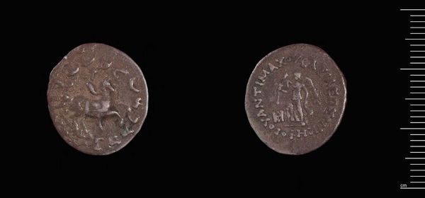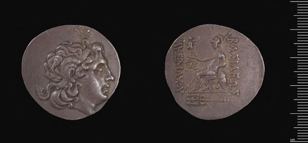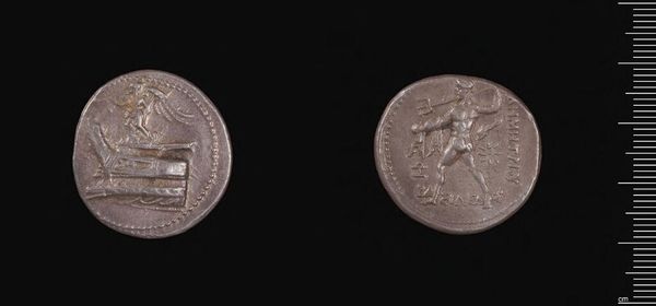 Curator: Before us, we have a Tetradrachm of Antiochos IV Epiphanes of Syria, its silver surface worn smooth with age. Editor: There’s an undeniable solemnity to it, a weightiness despite its small size. The silver gives it a cool, almost ethereal feel. Curator: Indeed. The coin's obverse features a detailed portrait, the king himself adorned with a diadem. The execution is quite skilled; note the precise articulation of his features. Editor: The diadem speaks volumes; it's not just decoration but a powerful signifier of kingship, divinity even. Symbols solidify power; here, the coin itself becomes an assertion. Curator: Precisely. And on the reverse, we find Zeus seated, further cementing Antiochos's claim to authority through association with the divine. Observe how the composition leads the eye. Editor: So, a convergence of political aspiration and divine sanction, captured in a single, circulated object. It’s like holding a piece of cultural memory, a little mirror reflecting an entire kingdom. Curator: A fitting reflection on the interplay of power and image, don't you think? Editor: Absolutely, power etched into metal, and now, viewed across centuries.