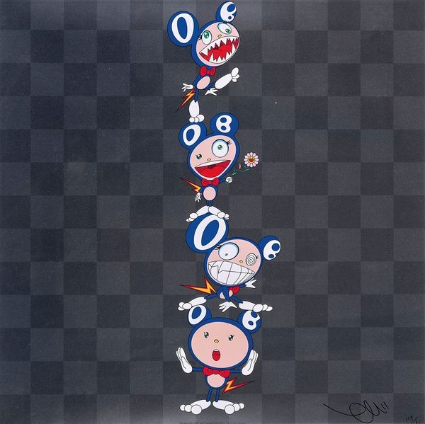 Takashi Murakami made this piece, IN CHA!;, and I’m immediately drawn to the way he lays down these super flat, almost cartoon-like colors and shapes. It’s a process of simplification, right? The surfaces are so smooth; you can hardly detect the hand of the artist. It’s like he’s hiding the process, making it all seem effortless and, dare I say, a little… manufactured? But that’s part of the charm, this tension between the handmade and the mass-produced. Look at the little mushroom figures; each one is slightly different, but there’s a uniformity there too. It’s in that contrast where things get interesting, where the piece starts to hum with life. Murakami reminds me a bit of Jeff Koons in his interest in pop culture and his embrace of ambiguity. Both artists play with our expectations, challenging us to reconsider what we value in art and in the world.