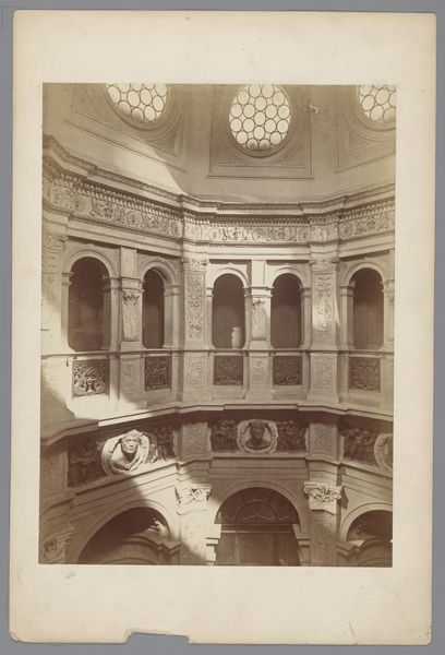 Eugène Atget made this photograph, titled "Bosquet de la Colonnade, les vasques," using the albumen silver print process. The composition emphasizes a play of architectural forms: massive columns frame a curved colonnade receding into space. Light and shadow accentuate the textures of stone and foliage, casting a melancholic mood. The fountain’s ornate carvings contrast with the plain surfaces of the columns, creating a visual tension. Atget's formal approach captures a sense of timelessness, reducing the scene to its basic structural elements. The photograph destabilizes traditional notions of perspective by flattening the space. In doing so, it invites contemplation on absence and the ephemeral nature of beauty. The photograph operates as a sign, referencing the grand designs of a bygone era while simultaneously questioning their relevance in the modern world. The structural composition, with its repetitive columns and arches, not only frames the space but also invites ongoing interpretation.