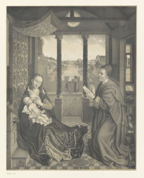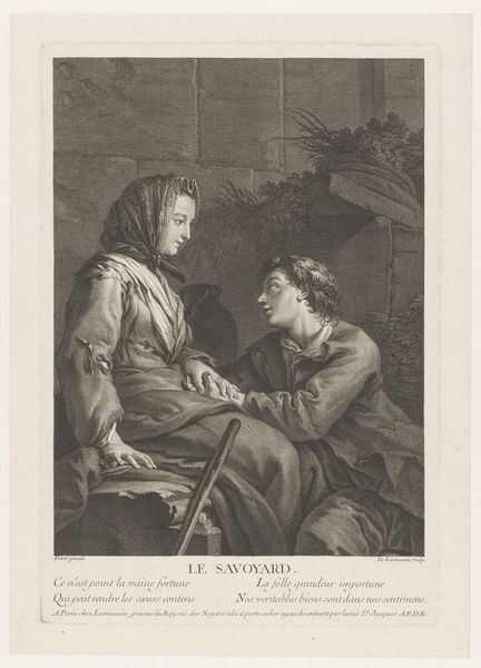 Curator: Looking at "Those from Savoy," an engraving conceived between 1752 and 1760, it immediately evokes a sense of stillness and perhaps weariness, wouldn’t you agree? The meticulous lines and cross-hatching build a palpable somberness. Editor: Absolutely. There is a deliberate melancholic tone in how the scene is set. The choice of focusing on the Savoyard women speaks volumes about class and gender roles in that era. What does the engraving medium contribute? Curator: As an engraving by Jacques Firmin Beauvarlet, the printmaking medium allows for a wider distribution and viewership. This makes accessible to the broader public themes of everyday life. Editor: Precisely, and the context here is vital. During that time, Savoyards often migrated for work. It subtly hints at displacement and the struggles of marginalized communities. The younger figure looks down sympathetically. I interpret her posture as carrying the burden of awareness. The older woman holds tools that could stand as signifiers of labour in the wool production. Curator: You highlight crucial connections to contemporary theories. Focusing on social context helps unpack its meaning and significance beyond aesthetics. Editor: Furthermore, it provides context regarding gender and work. Curator: Yes, consider how this artwork participates in the broader conversation about the public image and perhaps, the politicization of certain communities. What kind of narratives were emerging from representing Savoyards as genre images? What purpose might those stories fulfill? Editor: Exactly! Looking at “Those from Savoy”, I think, reveals to us both past realities and present-day issues, underscoring art's continuing social significance. Curator: Agreed. Through understanding the narratives surrounding this image, it fosters a dialogue on representation and lived realities.
