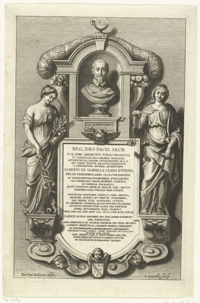 Curator: This engraving by Claude Mellan from around 1630, now residing in the Rijksmuseum, depicts a monument with a portrait of Catherine de' Medici, surrounded by the four graces. Editor: It has a curiously detached feeling, even though it is clearly intended as celebratory. It reminds me of something official, but almost ghostly because of its cool lines and pale color. Curator: It’s baroque, certainly, but with Mellan's signature precision. Engraving was such a powerful tool for disseminating imagery and ideologies at the time. Consider the use of classical figures: what cultural capital does Medici appropriate here? Editor: Power is definitely a motif that’s jumping out to me as well. These aren't just decorative figures, though; each grace carries potent symbols reflecting what women had to offer society. The mirror held by one might be about female vanity but perhaps represents introspection and the beauty ideal constructed around powerful women like Medici. It suggests a visual negotiation of feminine influence. Curator: Precisely. Note the positioning of the graces – framing Catherine within this structure almost deifies her. The allegory elevates the portrait beyond simple representation; it links her to enduring classical ideals. Think of the importance of the mirror in myth. Editor: It’s a complicated claim to legitimacy when you think about Medici’s own legacy. We could certainly examine Medici through her intersectional roles: her political authority, womanhood, and French-Italian identity during a time of much intersection conflict in the early-modern era. Curator: Indeed. And how would she intend that her political maneuvers are interpreted over time, when so closely associated with the aesthetic virtues embodied by the graces? The inclusion of Medici’s coat of arms underscores that association. Editor: What strikes me, still, is that while celebrating Catherine, the artwork also encapsulates a historical power dynamic where women's worth was often tied to carefully managed appearances. It prompts us to examine how women historically maneuvered for authority in restrictive systems. Curator: Mellan's engraving offers an intriguing lens through which to view the intersection of art, power, and gender in the Baroque period, wouldn’t you say? Editor: Absolutely. I think grappling with the context allows us to appreciate that in such historical depictions like these, celebration can sometimes mask a more conflicted reality for women in positions of power.