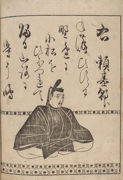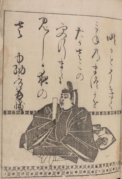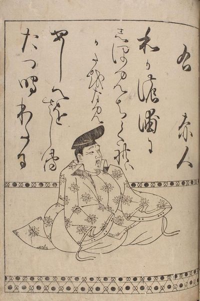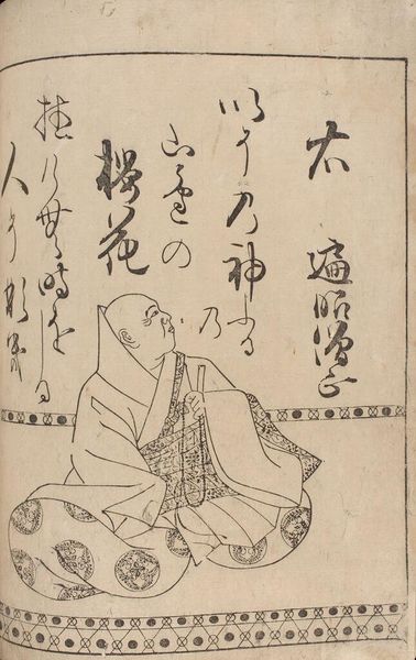 Curator: Looking at this hanging scroll, it strikes me how vulnerable the deer looks, almost childlike against the backdrop of Japanese calligraphy. What's your initial impression? Editor: It definitely evokes a sense of intimacy and fragility. Knowing that it is a work entitled "Basho and Deer," made with ink and color on paper sometime in the late 18th or early 19th century by Ki Baitei, provides a layer of context. The tenderness is heightened considering it is hanging scroll artwork, a traditional East Asian way of displaying painting. Curator: Absolutely. Hanging scrolls like this have a unique meditative quality, something I think Baitei was playing with here. The deer, an ancient symbol, is often associated with gentleness, grace, but it also appears in mythology with deep symbolic meaning. What might its presence mean in relation to the poet Basho? Editor: Considering the time period, perhaps the deer could represent resilience amid turbulent times. Looking at Basho himself, we see a figure adorned in relatively plain clothing, which signals the historical context. Perhaps it serves to create an interplay between the vulnerable and the composed. Curator: Interesting! I'm also drawn to the apparent serenity in Basho's gaze, despite the precariousness the deer may represent. There's a spiritual link established between human and animal, echoing the deeper connection between humanity and nature that often appears in East Asian art and philosophy. Editor: Yes, a connection perhaps rooted in empathy. But considering the tradition of Ukiyo-e in Japan, a floating world, could it also address the fleeting nature of life, the ephemeral? Is Baitei suggesting we observe and learn, but also realize the impermanence of everything, from culture, political unrest, to a brief, spontaneous connection to nature? Curator: That’s a valid point! It challenges the straightforward idyllic reading. The scroll seems to want us to contemplate the ever-changing circumstances in the world. Editor: The more one looks, the deeper one questions the composition, especially the balance that the animal represents and evokes. What looks soft on the surface might carry a deeper, almost troubling, undercurrent. Curator: A sentiment which resonates, indeed. Thank you for those ideas, it has offered me much to ponder! Editor: As for myself! The dialogue of time continues to be spoken across the canvas it seems.