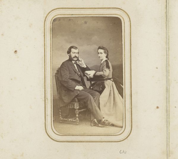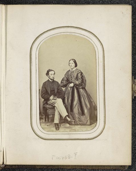 Curator: This is an albumen print dating from around 1876 to 1879, titled "Portret van een man en een zittende vrouw met hoed," created by the photographic firm Kannemans & Zoon. Editor: A rather stern-looking couple! The high contrast in this early photograph really emphasizes the textures of their clothing. And the composition, with the man standing stiffly beside the seated woman, feels quite formal. Curator: Precisely. Let’s consider the visual cues within the image itself. The verticality of the man contrasts with the horizontal emphasis of the woman's voluminous skirt. The stark background throws the subjects and the details in their dress into sharp relief, focusing on their structured forms. Editor: The woman's hat—a deliberate touch. What could this suggest about the image beyond simply recording appearance? Hats are an interesting symbol. Perhaps aspirational—the growing middle class adopting fashionable accessories? Curator: That's certainly a reading available. The hat and ornate chair subtly convey status and social aspiration. More intriguingly, her closed-off demeanor—a certain psychological barrier—contrasts the image's surface reading of middle-class respectability. Editor: And that serious expression, the stiff pose…it speaks of social constraints and the performance of identity. Consider that these kinds of early portraits were significant markers of one's social standing—objects laden with importance and even, perhaps, a desire for posterity. Curator: Agreed. And through a formalist lens, such considerations underscore photography's complicated early status as art. The photograph’s internal relationships make us see the subject less as biographical individuals, more as archetypes shaped by socio-economic forces. Editor: Ultimately, this image offers more than just faces from the past. It presents a microcosm of a society in transition. Through symbols of social codes, we decode values, anxieties, aspirations... it is a true treasure trove. Curator: I see the image in similar, although more abstracted, ways. By studying the formal design, and by parsing the symbolic intent, we gain better ways to talk about these moments as more than nostalgic time capsules. The materiality of art, and the art of seeing.