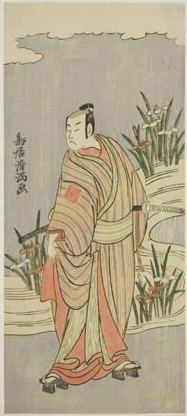Katsukawa Shun'ei created this woodblock print, "The Third Bando Hikosaburo as a Man Standing on the Bank of a River," sometime in the late 18th or early 19th century. The actor stands on the riverbank, leaning on a walking stick, under a branch heavy with leaves. The composition is arranged vertically; the figure, central and statuesque, dominates the pictorial space. The colour palette is restrained, with muted greens, browns, and creams defining the landscape and the actor’s attire. A formal analysis reveals the artist’s keen attention to line and pattern. The gentle curve of the riverbank and the cascading foliage contrast with the straight lines of the actor’s garments and staff. This contrast highlights Shun’ei’s understanding of semiotic systems, where each visual component carries a cultural code, inviting us to explore the layers of meaning embedded in this seemingly simple composition. The print challenges the notion of a singular, fixed interpretation and instead invites ongoing dialogue.