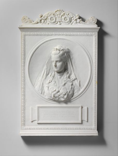 Editor: Here we have Augustus Saint-Gaudens' marble sculpture, "Mrs. Stanford White (Bessie Springs Smith)", created between 1884 and 1888. The work is currently held at the Metropolitan Museum of Art in New York. The first thing I notice is how serene and almost ethereal the woman appears; what strikes you about this piece? Curator: Serene is a good word. It whispers, doesn't it? Marble can do that. But to me, it's more than just serenity. There's a captivating blend of classical ideals and contemporary portraiture going on here. Do you notice how the drapery evokes ancient Roman sculpture, almost goddess-like? It’s as if Saint-Gaudens is trying to elevate Mrs. White. But it isn’t idealized completely – you see traces of a real, fashionable woman of that era. Editor: Absolutely, it feels like he's both immortalizing her and capturing a specific moment. But tell me more about this balance between the classical and contemporary. Where else can we see it? Curator: It’s in the slight tension between the crisp details of the face and hair versus the flowing softness of the marble drapery. Or, even, consider the frame – richly ornamented – which screams “Gilded Age”, clashing or maybe even…conversing with the classicism of the sculpted figure it frames? Do you think the combination works, or fights each other for our attention? Editor: That tension definitely adds depth! I think it works precisely because it reflects the complexities of the subject herself. It shows us how her beauty both adheres to a classic ideal and asserts her individuality. Thanks. That has helped me think more clearly about sculpture in general. Curator: And your observation reminds us that every portrait is, to some extent, a creative fiction, doesn't it? And a dance between artist, subject, and period. Something to remember, eh?