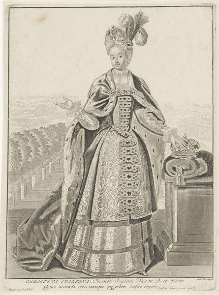 Editor: This engraving, "Geometrie," dates back to sometime between 1647 and 1718 and is attributed to Nicolas Bonnart. There’s a real sense of aristocratic privilege here, wouldn’t you say? What can you tell me about it? Curator: Well, seeing this portrait, I immediately think about the power dynamics inherent in the representation of knowledge during this period. The female figure, allegorically representing Geometry, is adorned in finery, positioned as a symbol of enlightenment but also controlled and framed by societal expectations. Who gets to possess knowledge and how is that access visually coded here? What does it mean to personify a field of study in this way? Editor: That’s interesting! I was mostly focusing on her elegant pose and elaborate dress. But framing her as representative of geometry… Is there a gendered aspect to it? Curator: Precisely! Think about the limited access women had to education at the time. This image, while seemingly celebrating Geometry, could also be subtly reinforcing patriarchal structures by idealizing the concept through a female figure, disarming its intellectual rigor, making the allegory passively available for male consumption. Editor: So it's about controlling access, even as it appears to be celebrating knowledge? That’s really subversive. Curator: The image can be read in multiple ways. The choice of the allegory and who it served are pertinent questions to ask. It pushes us to consider the role of gender, class, and representation in shaping our understanding of history, even in something as seemingly straightforward as a portrait. Editor: This has completely changed how I view the artwork. I went from thinking it was just pretty, to recognizing how art could reveal society's cultural complexities. Curator: That's the power of critically examining art, right? Seeing beyond the surface to uncover the layers of meaning reflecting social and political landscapes.