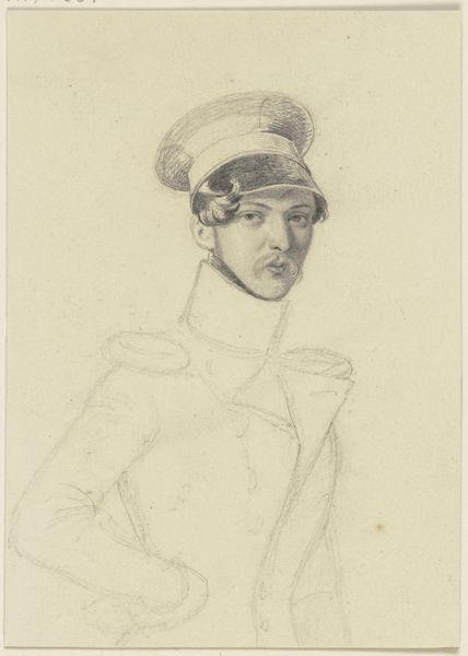 Curator: Welcome. Today we are observing Fernand Léger’s 1903 pencil drawing, “Portrait of Henry Viel, a friend of painter Fernand Leger,” currently held at the Musée National Fernand Léger in Biot, France. Editor: Wow, what a dashing fellow! I get this very specific vibe—a dandy teetering on the edge of mischief. Those slightly oversized ears and that playful mustache—it’s as if Léger is winking at us through the portrait. Curator: Indeed. The composition employs a delicate yet confident line work, characteristic of early 20th-century Impressionistic portraiture. Notice how the hatching creates volume without fully solidifying form. The artist emphasizes certain facial features like the ears and the pronounced mustache with bold strokes. Editor: The hatching technique almost vibrates with energy, especially behind the head. And the way the suit is suggested, rather than explicitly drawn, gives it an ethereal, almost dreamlike quality. What is going on in his right shoulder, I would guess is his right shoulder. Looks like a balloon and is un-anatomical Curator: Observe the balance achieved through asymmetry. Viel's head is tilted slightly, and one arm is resting on a chair. These subtle details activate the composition, lending it a sense of informal spontaneity. Also, note the very restricted tonal range. The image's light atmosphere provides no points of contrast or relief. Editor: You are so correct. It’s this very feeling that keeps drawing my eye back to his gaze, the slightly averted gaze, and the very slight smile on his face. All things combined provide that subtle dynamism. I get a sense of curiosity in his person. And also perhaps a knowing amusement? What could he be smiling at. This question drives curiosity for me. Curator: The piece offers insights into Léger's early style before he moved into Cubism and his characteristic focus on machinery and modernity. You could view this work as an early exercise in formal rendering and subjective expression of character. Editor: I find this quite compelling. To see an artist on the cusp, experimenting, figuring things out. The image captures more than just Viel's likeness. In doing so, it tells us about friendship, artistic exploration, and the very nature of portraiture. Curator: It reminds us that even seemingly simple sketches can convey depths of personality, historical context, and the restless spirit of artistic creation. Thank you for considering with me today. Editor: Absolutely, thanks to you! What an unexpected peek into Léger’s creative trajectory.