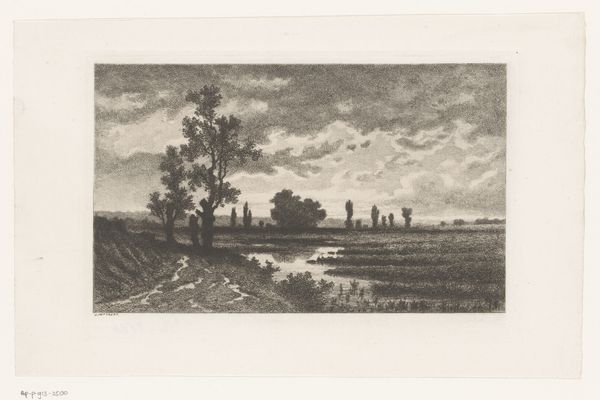 H. Gerner Lund created this print, Aften efter uvejr, using etching in Denmark, likely around the late 19th century. In it, we see a landscape after a storm, a lone figure in the distance, and a sky still heavy with clouds. But what does this image mean in its time and place? Denmark in the late 1800s was a country undergoing significant change, with a growing sense of national identity. Artists turned to the landscape to express these feelings. Lund's choice of etching, a printmaking technique that allows for detailed and delicate lines, is also significant. Etching was often associated with the democratization of art, making images more accessible to a wider audience beyond the elite. Understanding this artwork means delving into the social and cultural history of Denmark at this time. Museum archives, historical societies, and even meteorological records could help us understand the context of this image and its role in shaping Danish identity.