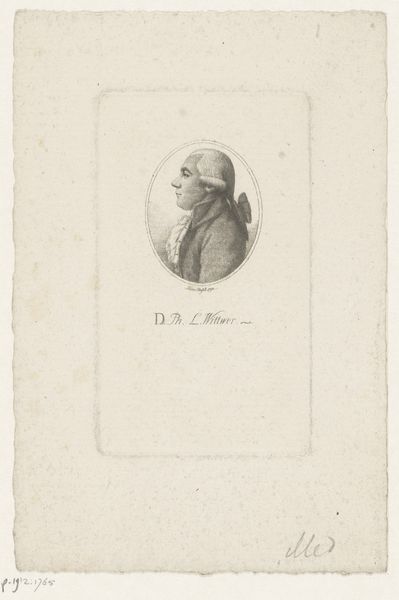Editor: Here we have Heinrich Pfenninger’s "Portret van Melchior Pfintzing", an engraving from somewhere between 1759 and 1815. The crisp lines of the engraving, set against the aged paper, lend it an antique feel, almost haunting. What compositional choices strike you most powerfully? Curator: Primarily, the oval format contains the subject's likeness. The lines create tonal variation, giving the subject volume within a contained setting. Notice the artist's expert use of hatching to articulate shadow and form. Editor: Hatching? Curator: Yes, closely spaced parallel lines. Observe the density and direction. Where the lines converge, shadows deepen, lending dimension. This adds a layer of complexity to what seems like a simple portrait. Do you see a deliberate manipulation of the engraving itself, apart from the pure representation? Editor: I do now. The density creates a rich surface. Almost like texture, even though it is printed on paper. But why an oval, as opposed to a rectangle or square? Curator: That gets to a core tension. Why *this* shape? Because it focuses your gaze intently upon Pfintzing's face. Note how it contrasts with the paper which the image has been applied. The difference in colour affects how we interpret this engraving; had the paper been darker, the face would appear brighter in contrast, potentially affecting our engagement. Editor: That makes sense. By looking at the pure composition, not just who it depicts, we learn more about how images function. Curator: Indeed, the formal properties work together to generate meaning and evoke our curiosity.