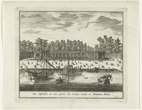 Curator: This is "Gezicht op de Herenpoort te Leiden," or "View of the Herenpoort in Leiden," an engraving by Andries van Buysen the Elder, dating back to 1734. Editor: The intricacy of the line work immediately strikes me. It feels very ordered, and even peaceful despite the many distinct elements. Curator: It's a lovely example of Dutch Golden Age art. Think about what Leiden represented in 1734—a major textile center, a university town, and a place grappling with ideas of trade, empire, and social structure. This gate would have been a crucial point of exchange. Who passes through, who is excluded? The image shows people, commerce, recreation all in the space around the gate. Editor: Absolutely. Look closely and you realize it is so constructed and deliberate! The artist emphasizes this precise rendering, not just of architecture but of the soft foliage, down to each ripple in the water. It’s a crafted reality, really foregrounding human intervention in the natural world. Curator: And the people are placed very deliberately. The composition of the finely dressed people closest to us emphasizes the performance of gender and class in the society of that time, wouldn't you agree? The anglers and the boats add further context to economic opportunities. Editor: Precisely, and it's impossible to ignore the printing process itself here. This artwork could not have existed without significant amounts of planning and labor. It really encapsulates the human impulse to manipulate resources for aesthetic means. Engraving and printing techniques opened art for a wider group. Curator: Yes, the democratizing influence of print media can't be understated. An image like this would have circulated widely, shaping public perceptions of the city. What sort of vision of society does it portray, and for whom? I suspect that Van Buysen, as an artisan himself, intended that ordinary citizens should celebrate a sort of access. Editor: Exactly. So beyond the visual qualities of this Dutch city, we are presented with a complex understanding of Dutch society that emphasizes process, craft, class, and power. Curator: What a lovely example of Leiden's civic life and its reproduction in popular visual culture! Editor: I agree. Analyzing this work offers so much insight into the historical conditions and material making of 18th century Netherlands.