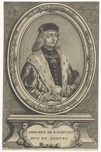 Curator: Before us, we have an engraving dating to between 1759 and 1822, entitled "Portret van G.F.I. de Verhulst," created by Antoine Alexandre Joseph Cardon. Editor: My first impression? The figure has an almost unsettlingly calm expression given the...eccentricity of the headwear. It's definitely giving me "slightly-askew nobility." Curator: That "eccentric" headwear is telling, I think. Consider the wider context of Dutch society during this period—this portrait, ostensibly of a member of the aristocracy, reflects increasing anxiety about the relationship between civic duty and privilege. The oddness is definitely the point. Editor: You're right, I didn't initially see the book he is reading and how that suggests he is intellectual. The headwear has a subtle echo in the leaves of laurel. The image hints at virtue, not vanity. What do you think? Curator: Yes! And beneath him, the iconography shifts again. The coat of arms and trumpet denote heritage and status. Note also, though, how the other symbols - books and botanical fronds, and so on- suggest intellectual and artistic achievement are becoming newly intertwined markers of status alongside wealth and class. Editor: The baroque framing, it’s deliberate in how the style underscores all the shifting levels of self-identification within a changing culture. I can see now that it underscores social mobility as something relatively novel, but sought-after at that moment. Curator: Precisely. I believe it mirrors society, navigating complex political and cultural crosscurrents, particularly how an aristocratic identity was changing because of enlightenment philosophy and civic revolutions in America and France. Editor: Thank you. I confess I initially misread the artwork. It seemed, initially, as one thing, but you explained the greater significance. I will be walking away pondering questions of representation in shifting socio-economic and political structures.