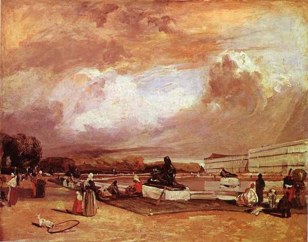 Curator: This is "Pirna Seen from the Right Bank of the Elbe," painted by Bernardo Bellotto around 1750, you can currently find it in the Hermitage Museum. Editor: Wow, what strikes me immediately is how incredibly still it all feels. It’s like the whole scene is holding its breath, the river reflecting the sky perfectly. You almost expect the people on the bank to be frozen in time as well! Curator: Absolutely. Bellotto was known for his precision, treating the cityscape almost like a portrait subject. Notice the strategic deployment of light to articulate architectural details, which reinforces civic pride. Editor: He's nailed that balance between representation and... poetry? I love the little brushstrokes on the water's surface, hinting at movement when everything else feels so solid. I wonder what those three figures near the shore are chattering about? Probably the same things we are right now. Curator: Perhaps, and speaking of chatter, it’s important to contextualize paintings like this within the cultural project of nation-building. Representations of the city helped cultivate shared identities, visually narrating power structures, urban development and a general sense of belonging. This artwork's presence in places like the Hermitage reflects a specific kind of curation. Editor: That makes me think: paintings like this one remind people that even solid stones, solid social structures, exist only because we can imagine them. This river used to see different boats, and different people with other languages, I'm sure. A world is always changing under the one the eye is looking at. It’s like a historical photograph rendered with the tenderness and precision of a master's hand. What’s not to love? Curator: A pertinent insight. It provides a compelling perspective on urban landscapes that still resonates today, a vision with political and aesthetic weight. Editor: So well, thank you for your explanation; I love leaving a conversation knowing a little bit more.