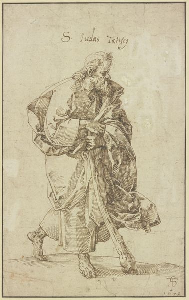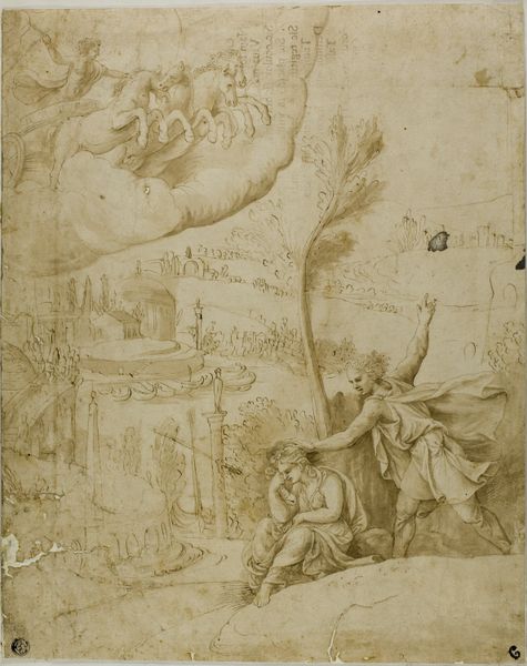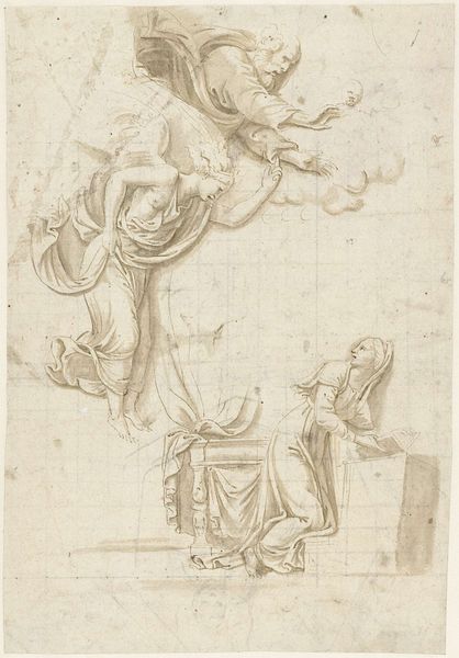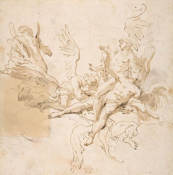 Luca Giordano created this ink drawing, titled "The Almighty with Angels", in the late 17th century. The sepia tones and dynamic composition immediately draw us into a celestial vision. Giordano masterfully uses line and form to create a sense of movement and depth. The Almighty is enthroned above a congregation of angels, their small bodies rendered with quick, swirling lines, conveying their ethereal nature. Below, additional groups of angels further emphasize the heavens opening before us. What is intriguing is how the artist uses the structure of the page itself. The composition is divided, almost like a stage, creating a hierarchy, with God in the upper section, presiding over the cherubic throngs. These divisions, combined with the energetic lines, destabilize a conventional, static religious scene. In closing, observe how Giordano used ink to create a sense of both the divine and the dynamic. This drawing invites us to contemplate the power of art to not just depict, but also to interpret and reimagine sacred narratives.