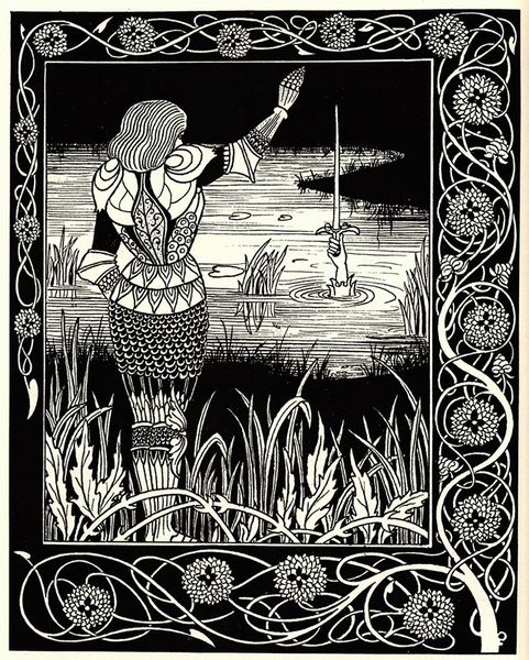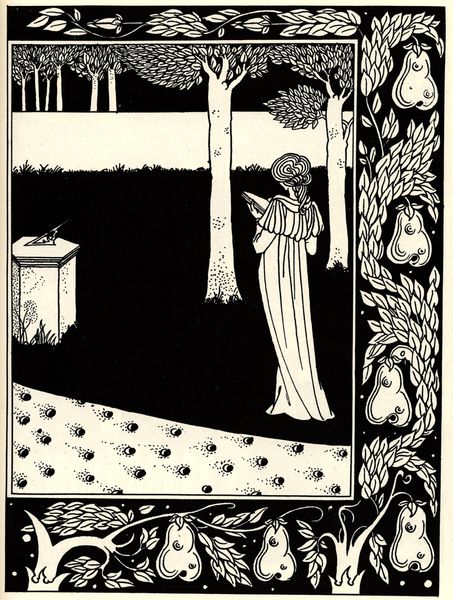 Curator: Welcome, I'd like to introduce you to Aubrey Beardsley’s drawing "The Beale Isoud at Joyous Gard," created in 1894. It’s rendered in ink, displaying a strong emphasis on line and pattern. Editor: My immediate impression is one of contained elegance. The stark black and white creates a dramatic visual, but it feels strangely still, almost frozen. There is some very stylized eroticism on display. Curator: Beardsley was a central figure in the Aesthetic movement and his illustrations often challenged Victorian social and moral values through subversive imagery. This piece, inspired by Arthurian legend, reflects his interest in medievalism, something widespread within Arts and Crafts Movement. Editor: Yes, and what does Joyous Gard itself signify? I am drawn to the stylized pears around the border which seem to drip with a saccharine morbidity, or even worse. Curator: Certainly the pear motif lends a visual weight. Notice also the rigid formalism typical of much decorative art of this period which provided him a framework in which to develop, comment and ultimately critique, Victorian ideals surrounding the body, class and societal roles. Editor: Absolutely, her gown looks very peacock like. And then those faces in the fruit; they stare back with an accusation! Curator: His visual vocabulary became a very influential commentary and criticism on the cultural landscape and its artistic institutions. Editor: Looking at "The Beale Isoud," it strikes me how it still provokes such dialogue around representation, gender and societal expectations over a century later. And the obvious sensuality with death always just in the frame. Curator: It’s precisely this continuous renegotiation of meaning and engagement with socio-historical context that underscores the power and importance of studying these artifacts. Editor: A striking piece that manages to simultaneously embrace and challenge its historical moment and one can say about the legacy and impact of Beardsley.