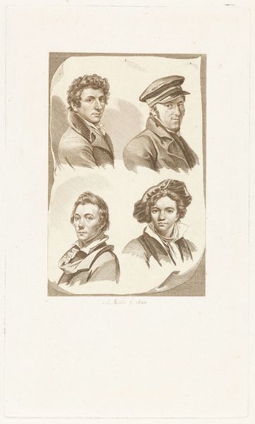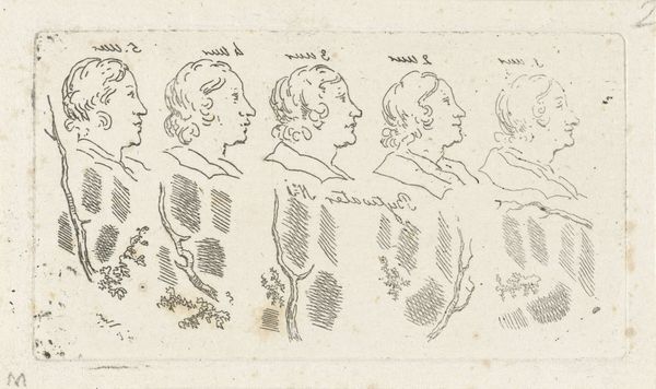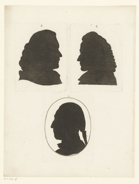 Editor: This is an 18th-century print called "Four Male Heads, Two in Silhouette, in Ovals." It's attributed to an anonymous artist and held at the Rijksmuseum. I'm immediately struck by the stark contrast between the detailed portraits and the solid silhouettes. What do you see in this work? Curator: Immediately, I'm drawn to the historical and psychological weight of portraiture during that period. Silhouettes, in particular, emerged as an accessible, even democratic form of representation. The "shadow portraits," if you will, are really about presence and absence, aren’t they? What memories and associations are triggered by the missing features? Editor: That’s interesting; I hadn’t considered the “absence” part so much. Why do you think the artist mixed fully realized portraits with simple silhouettes? Curator: Perhaps to suggest varying degrees of societal access or perhaps some commentary on hidden identities. Faces fully rendered versus faces masked: It calls to mind power dynamics or social commentaries that the silhouettes symbolize, like anonymous whispers versus loud declarations of the time. Consider also the enduring visual language that this form of portraiture provides for us to contemplate collective cultural values. Editor: So, they might be saying something about social status or secrets, and those shapes carry so much history. It gives me a lot to think about, recognizing these portraits as echoes of historical voices. Curator: Precisely! These visual symbols speak volumes across centuries, hinting at stories beyond what we see on the surface.