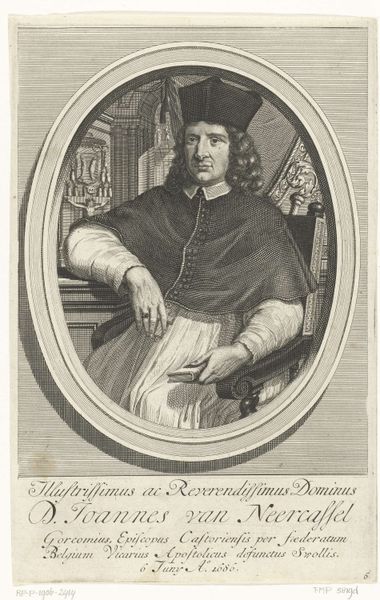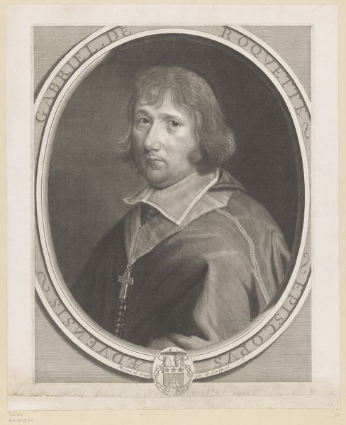 Editor: We’re looking at Theodor Matham’s engraving, "Bernard Hoogewerf," created in 1653. It's currently housed at The Met. The work feels very staged, almost performative, but also very detailed in the depiction of textures. What catches your eye in this portrait? Curator: The careful orchestration of light and shadow immediately asserts itself. Observe how Matham employs hatching and cross-hatching to delineate form, thereby creating an illusion of three-dimensionality on a two-dimensional plane. Notice, in particular, how the strategic deployment of light across Hoogewerf's face accentuates his gaze, drawing the viewer into an engagement with the subject's intellectual and spiritual interiority. How does the rendering of his garment function, would you say? Editor: It looks so ornate and heavy. There is a weight that seems to emanate from those folds. Is this intentional, perhaps a way of adding more prestige to the subject? Curator: Precisely. The meticulous rendering of Hoogewerf's attire speaks to the visual language of status. But let us not overlook the crucifix situated in the upper right quadrant. Its presence complicates a straightforward reading of the portrait as mere glorification, inviting deeper considerations of faith, suffering, and the transient nature of worldly accomplishment. Do you perceive any tension arising from the interplay between portrait and crucifix? Editor: Definitely! The way the crucifix is positioned behind him seems like more than just decoration. It feels very intentional, not merely ornamentation, creating almost a background narrative, overshadowing Hoogewerf himself. I find this perspective really valuable! Curator: Indeed. Considering the careful modulation of tone, texture, and symbolism, this portrait offers itself as a study in the intricate interplay between earthly authority and spiritual devotion, wouldn’t you agree?