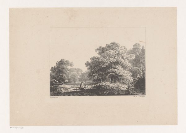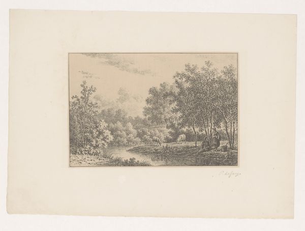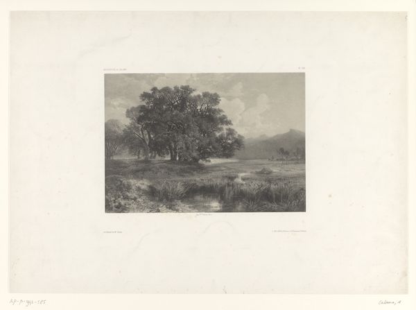 Curator: This engraving, crafted by Henri Antoine Gaston de Gourcy between 1867 and 1878, is titled "View of an Island at Neuvic." Editor: It possesses such a wonderfully tranquil quality. The stillness of the water reflecting the distant structures, offset by the dominating tree… it feels like stepping into a reverie. Curator: Indeed. Gourcy, active during the burgeoning realist movement, depicts the Ile de Neuvic with an exacting attention to detail. It reminds us that this locale, in the Dordogne region of France, carried significance beyond its scenic charm, and was subject to profound sociopolitical change as France modernized. Editor: The towering tree takes center stage; its sprawling branches seem to safeguard the figure resting beneath. Trees as symbols of resilience and ancient wisdom—we find echoes of this across diverse cultures. This scene calls forth our connection to nature, and evokes introspection. Curator: That's certainly what landscape aesthetics encouraged then. Prints such as this were highly circulated, bringing representations of regional and national identities into middle class homes, thus, fostering ideas about French identity and its relationship to the land itself. Editor: The solitary figure heightens that sense of introspection. We are subtly invited to share their perspective and consider our place within the broader landscape. Notice how the delicate balance between light and shadow contributes to that pensive mood. Curator: Yes, the artist captures not just the scene but also the very air, making us think about changing conceptions of leisure at this historical juncture, as new ideas and experiences were now circulating. Editor: The power of images like this is their layered symbolism. The tree, the water, the resting figure - it becomes a space where our personal interpretations enrich the historical narrative. Curator: A landscape as an expression of a historical moment and cultural values… something that continues to evolve in how we look at these images now. Editor: Exactly, revealing how representations shape, and are shaped by, the passing of time.