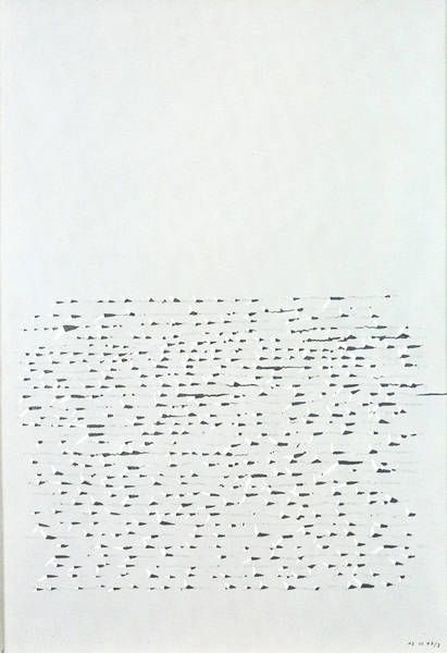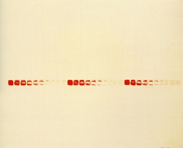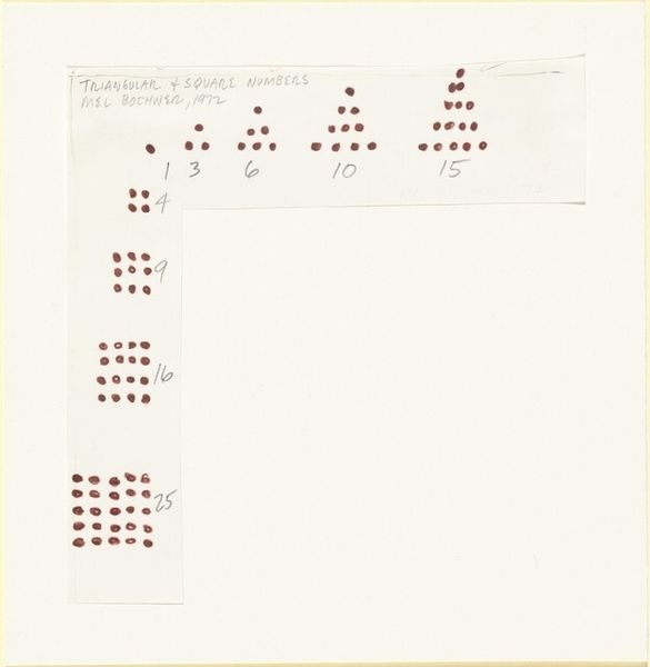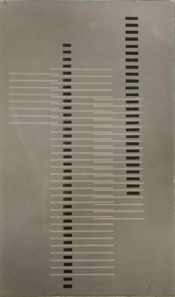 Curator: Hamish Fulton’s "Untitled. 21 Day Walk 1987," presents us with a conceptual exploration of walking as art. Editor: The sparseness is striking, isn't it? The near-monochrome palette and the regimented text create a mood of meditative austerity. Curator: Indeed, Fulton's walks are documented through text and photography, challenging our understanding of landscape and experience. His walks become interventions. Editor: I see a structural grid almost, the arrangement of the words like musical notation, each mark indicating a step, a pause. The materiality of language takes center stage. Curator: Walking, for Fulton, is a political act, rejecting consumerism and embracing a slower, more contemplative way of life, deeply connected to nature. Editor: Yes, and the repetitive, almost meditative quality of the text mirrors the act of walking itself, reducing experience to its barest, most essential components. Curator: It invites a dialogue about the relationship between land art and social consciousness, I think. Editor: For me, it is the rhythm and structure of the text that captivates.
