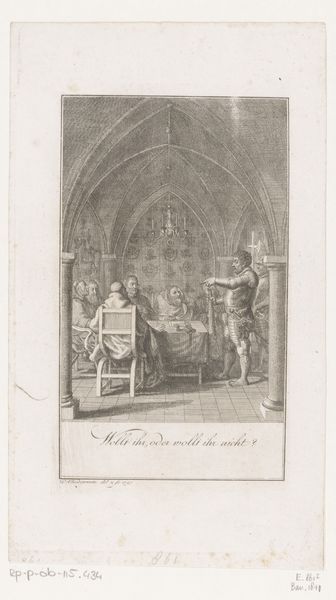 James Taylor created this print, "The Death Warrant Read to Mary, Queen of Scots in the Hall Wherein She was Beheaded," sometime in the late 18th century. It depicts the final moments of Mary Stuart, a Catholic Queen who threatened the Protestant English throne, and whose story has been told and retold countless times. Here, we see Mary seated, listening to the reading of her death warrant, surrounded by those who would witness her execution. Her calm demeanor is in stark contrast to the gravity of the moment. Taylor's work gives us a glimpse into the gender and religious politics of the 16th century, where a woman's claim to power was seen as inherently destabilizing. The print invites contemplation on the complex interplay of power, religion, and gender that defined Mary's life and tragic end. Consider how the artist uses the setting, a grand hall, to emphasize the spectacle of the event. While the print commemorates a specific historical event, it also speaks to broader themes of authority, justice, and the narratives we construct around historical figures.