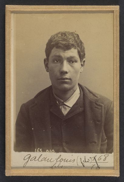 Curator: This gelatin-silver print, titled "Godard. Armand, Alexandre. 18 ans, né le 11/3/75 à Paris XVIIe. Électricien. Cris séditieux. 6/1/94," was produced in 1894. Editor: Even without knowing its background, I’m immediately struck by the intense, almost haunting gaze of the subject. The limited tonal range of the silver print adds a timeless quality. Curator: Indeed. The artist, Alphonse Bertillon, pioneered forensic photography. These portraits, while seemingly straightforward, played a critical role in developing methods of criminal identification in late 19th-century Paris. Editor: The starkness emphasizes his individuality even as he’s subjected to systematic cataloging. Notice how the flat lighting removes all romanticism. The frontal pose is so devoid of expression. Curator: That's right. The subject, identified as Armand Alexandre Godard, an 18-year-old electrician, was presumably arrested for seditious cries. This work reveals how photography was becoming an instrument of social control. Editor: And in this application, it’s truly detached. There's an attempt at scientific objectivity. It seems almost cruel but incredibly powerful in its intent, though. The markings on the photograph – the numbers, the name – serve as labels, stripping the man of his humanity, reducing him to data. Curator: These photographic methods and classification systems speak volumes about the fears and anxieties around crime, immigration, and the social order of the time. Editor: It becomes something more significant through Bertillon's method, achieving, against the odds, real presence and impact by denying artistic intention. Curator: Bertillon created these photographs for functional reasons. That speaks powerfully about our assumptions of photography as an aesthetic medium and a method for the state control and social order. Editor: It certainly pushes one to contemplate the diverse functions inherent within portraiture as both documentation and artifice.